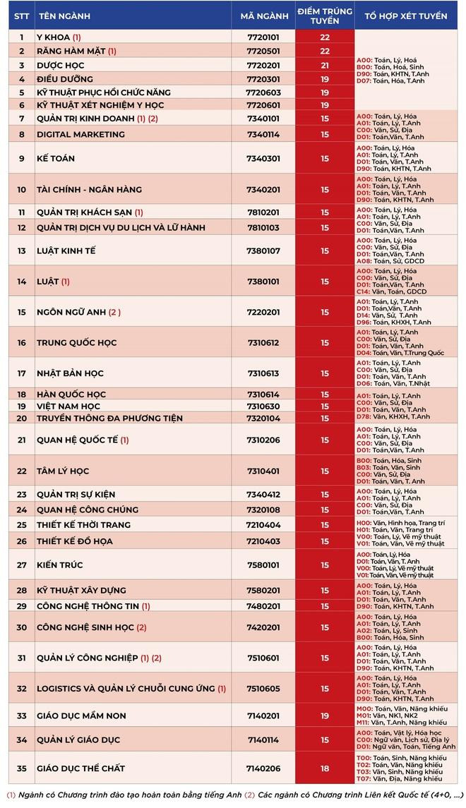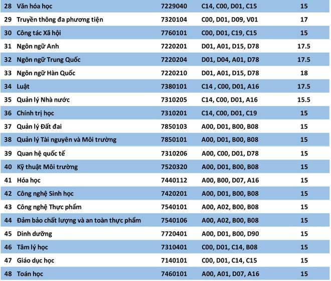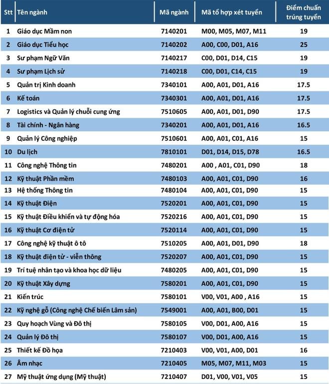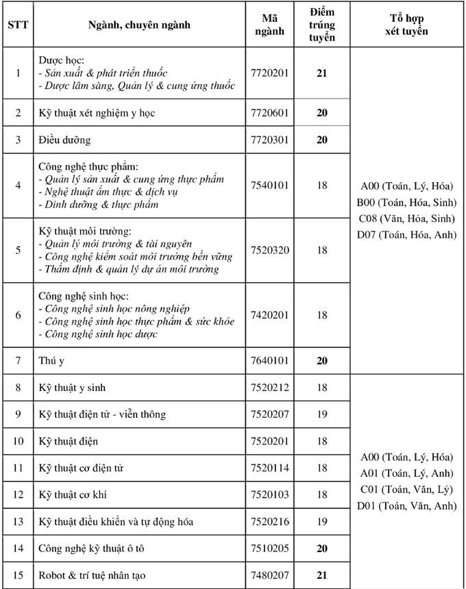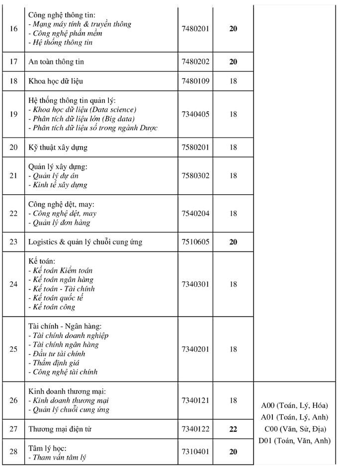 Các ngành Công nghệ thông tin, An toàn thông tin, Công nghệ kỹ thuật ôtô, Logistics và quản lý chuỗi cung ứng, Tâm lý học, Marketing, Thú y, Điều dưỡng, Kỹ thuật xét nghiệm y học lấy 20 điểm. Các ngành còn lại dao động từ 18-19 điểm.