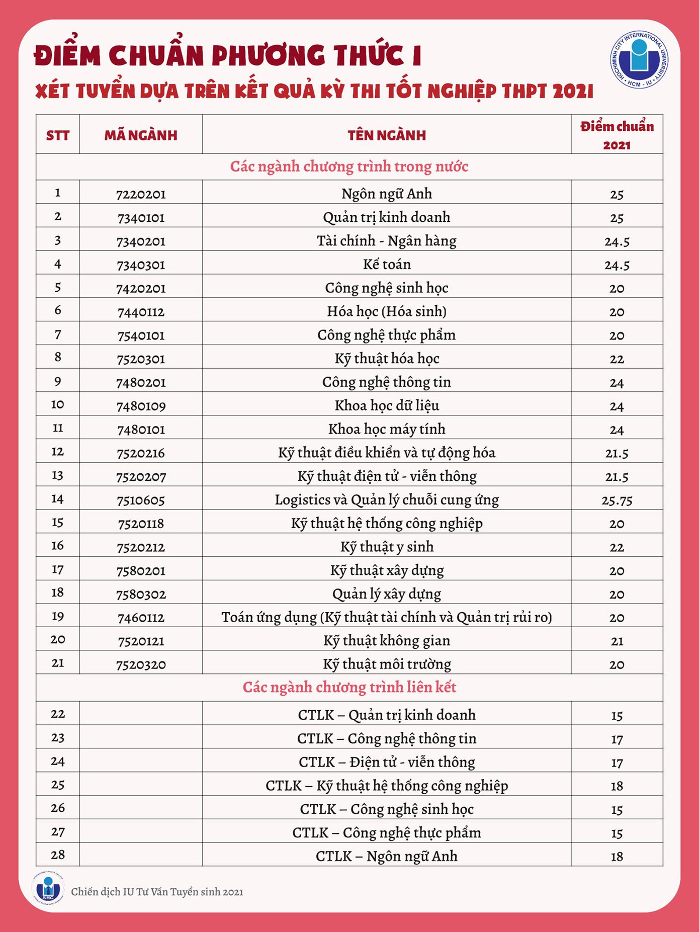 Năm nay, ĐH Quốc Tế (ĐHQG TP.HCM) lấy điểm chuẩn cao nhất cho ngành Logistics và Quản lý chuỗi cung ứng với 25,75 điểm. Đứng thứ hai là các ngành Ngôn Ngữ Anh, Quản trị kinh doanh với 25 điểm. Các ngành còn lại từ 15 điểm (cho chương trình liên kết nước ngoài) và 20 điểm (cho các chương trình trong nước).