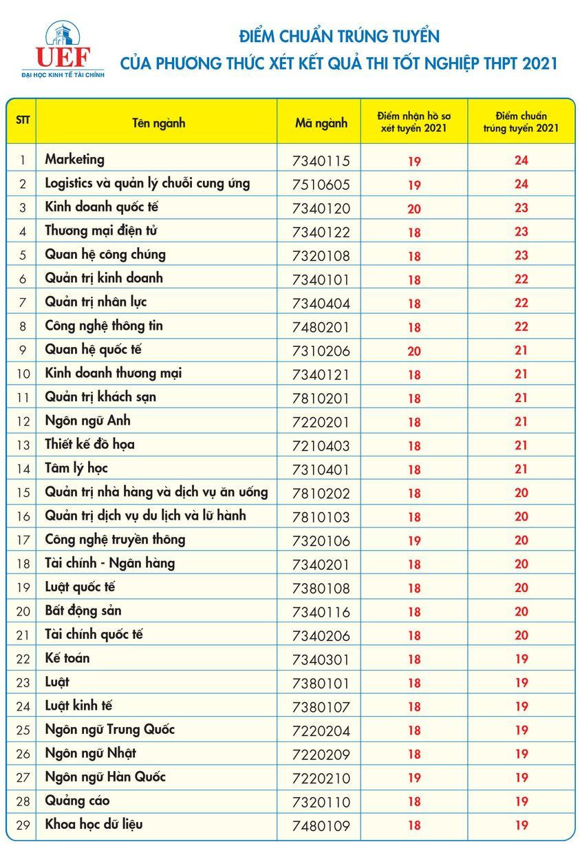 Điểm trúng truyển cao nhất là 24 điểm, thuộc về hai ngành Marketing, Logistics và quản lý chuỗi cung ứng. Các ngành Quản trị kinh doanh, Quản trị nhân lực, Công nghệ thông tin có mức điểm trúng tuyển là 22.