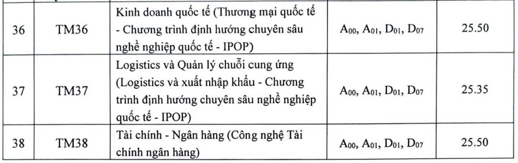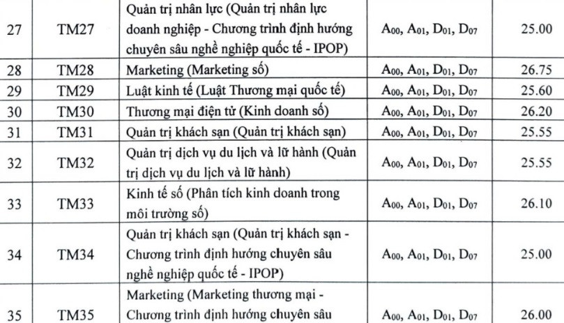 TPO - Trường đại học Thương mại công bố điểm chuẩn từ 25 đến 27 cho tổ hợp ba môn thi tốt nghiệp, cao nhất ở ngành Marketing thương mại.