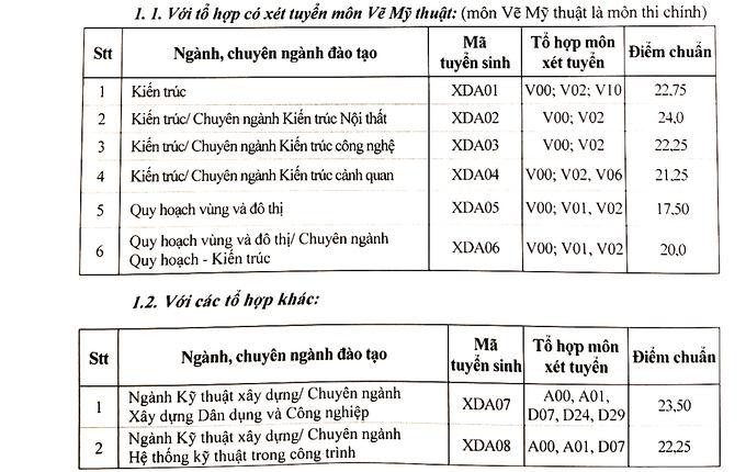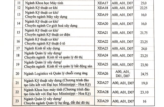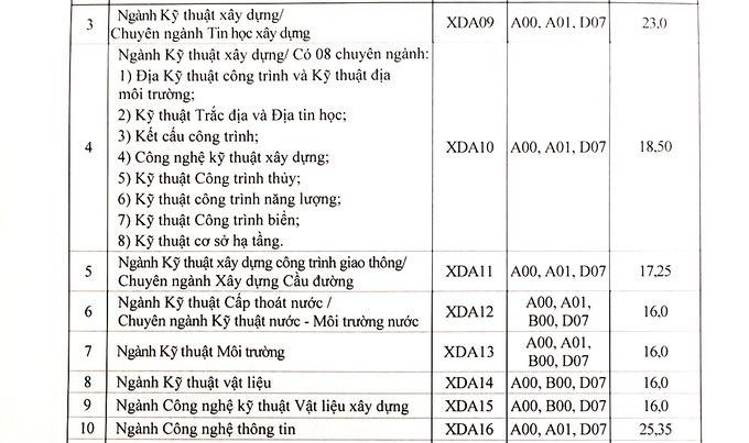 Trong khi đó, nhiều ngành của trường vẫn chỉ lấy mức 16 như năm ngoái, chẳng hạn chuyên ngành Máy xây dựng và Cơ giới hóa xây dựng thuộc ngành Kỹ thuật cơ khí, ngành Kỹ thuật môi trường, Công nghệ kỹ thuật Vật liệu xây dựng.