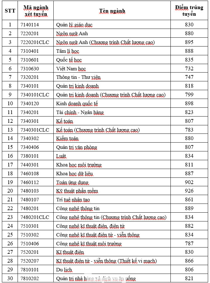 Theo đó, điểm chuẩn của 30 ngành (trừ các ngành sư phạm) dao động từ 732 đến 926 điểm trên thang điểm 1.200. Ngành có điểm chuẩn trúng tuyển cao nhất là Kỹ thuật phần mềm và thấp nhất là Việt Nam học.
