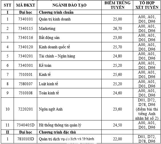 Điểm trúng tuyển nói trên là tổng điểm thi của 3 môn thi/bài thi trong tổ hợp xét tuyển, không nhân hệ số (trừ ngành Ngôn ngữ Anh), được làm tròn đến hai chữ số thập phân, không có bài thi/môn thi nào trong tổ hợp xét tuyển có kết quả từ 1,0 điểm trở xuống.