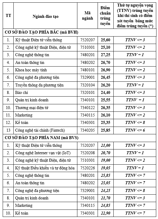 Hai ngành An toàn thông tin và Công nghệ đa phương tiện tăng nhẹ khoảng 0,2 điểm, còn lại giảm nhưng mức giảm chỉ 0,1 đến 0,3 điểm. Năm nay, lần đầu Học viện Công nghệ Bưu chính Viễn thông tuyển sinh ngành Báo chí, điểm chuẩn 24,4.
