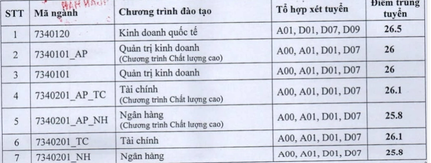 Nhiều ngành của Học viện Ngân hàng có mức điểm chuẩn từ 26 điểm trở lên như Kinh doanh quốc tế lấy 26,5 điểm; Công nghệ thông tin lấy 26,2 điểm. Ngoài ra, ngành Ngôn ngữ Anh và Kinh tế lấy 26 điểm. Cụ thể như sau: