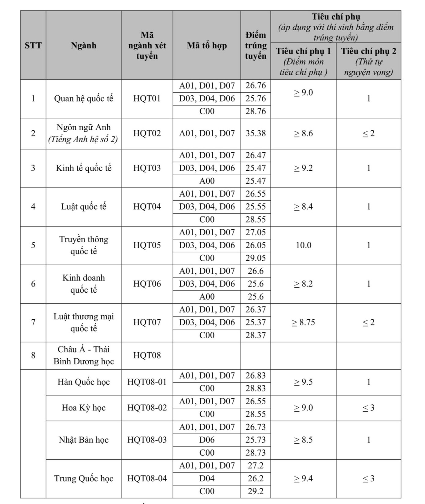 Đối với ngành Quan hệ quốc tế, Kinh tế quốc tế, Luật quốc tế, Kinh doanh quốc tế, Truyền thông quốc tế, Châu Á - Thái Bình Dương học và Luật thương mại quốc tế: Điểm xét tuyển tính trên thang điểm 30, gồm tổng điểm của 3 môn thi, cộng với điểm ưu tiên theo khu vực, đối tượng theo quy định của Bộ GD&ĐT (nếu có). Mức điểm được làm tròn đến hai chữ số thập phân.