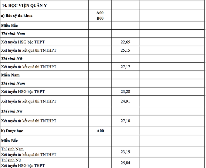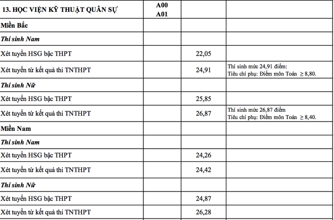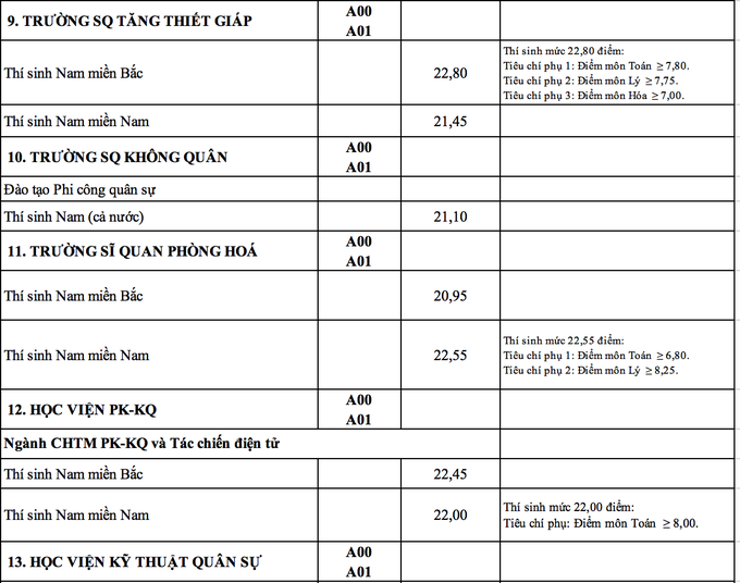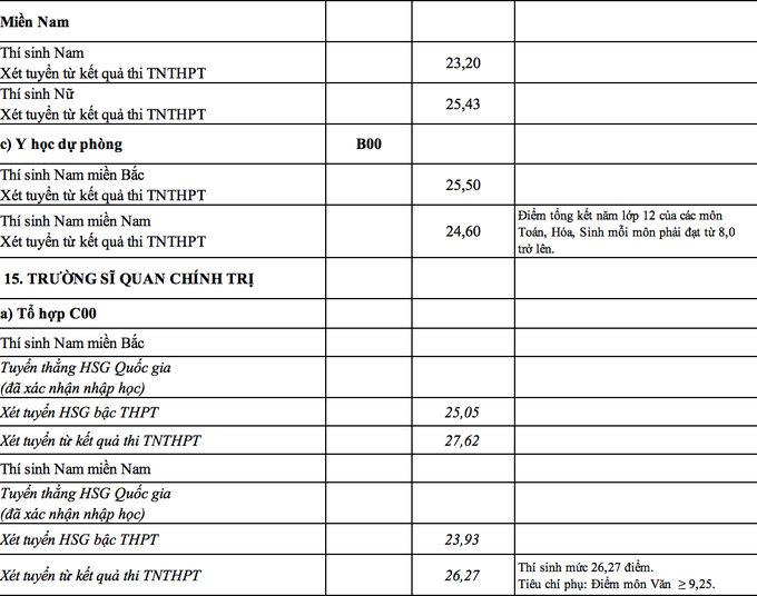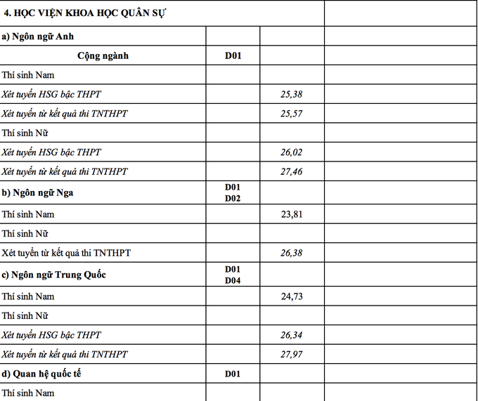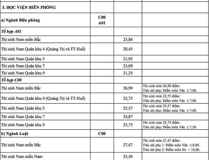 Ngành Ngôn ngữ Trung Quốc của Học viện Khoa học quân sự tuyển thí sinh nữ có điểm trúng tuyển cao nhất 27,97 điểm. Xếp sau đó là ngành Luật học tuyển thí sinh miền Bắc của Học viện Biên Phòng với điểm chuẩn là 27,47; ngành Biên phòng, tuyển sinh tổ hợp C00 có điểm chuẩn với thí sinh miền Bắc là 26,99. Học viện Hậu cần có điểm trúng tuyển với thí sinh nữ ở miền Bắc là 26,01, thí sinh nữ ở miền Nam là 25,6. Điểm chuẩn cụ thể các ngành của từng trường như sau: