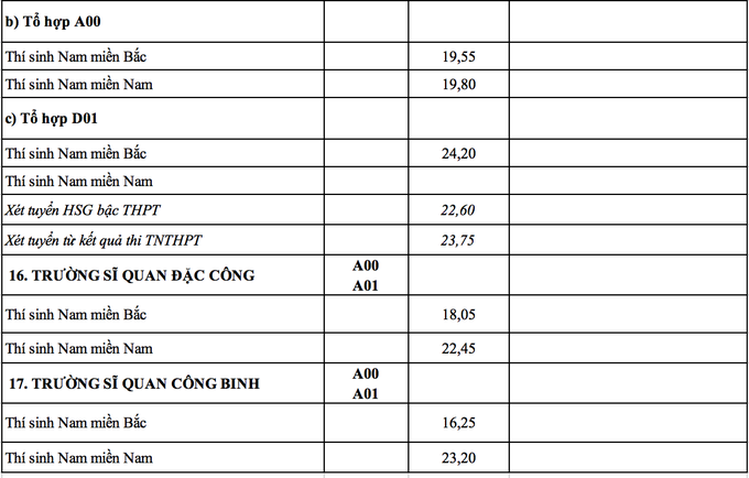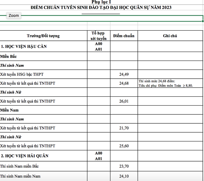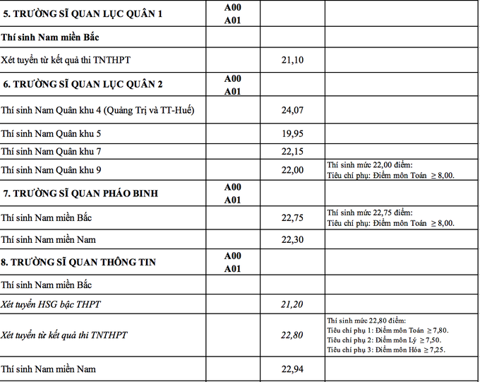 Trước đó, khoảng tháng 7/2023, Ban Tuyển sinh Quân sự Bộ Quốc phòng công bố mức điểm sàn xét tuyển (điểm nhận hồ sơ xét tuyển) đại học, cao đẳng hệ quân sự chính quy năm 2023, cao nhất là 23,5 điểm.