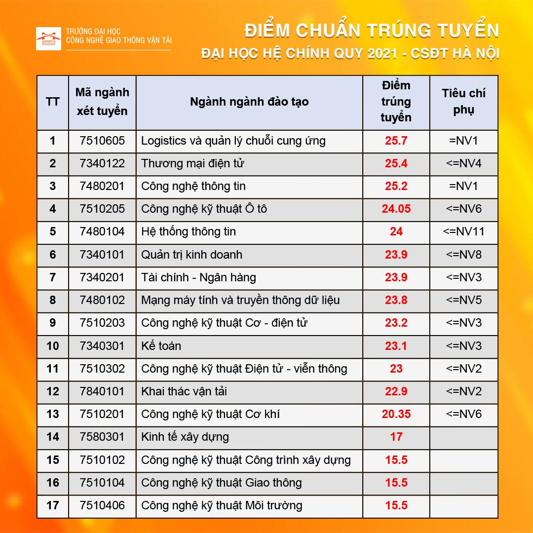 Hội đồng tuyển sinh Trường Đại học Công nghệ Giao thông vận tải đã công bố điểm chuẩn trúng tuyển Đại học hệ Chính quy năm 2021 đối với phương thức xét điểm thi tốt nghiệp THPT.