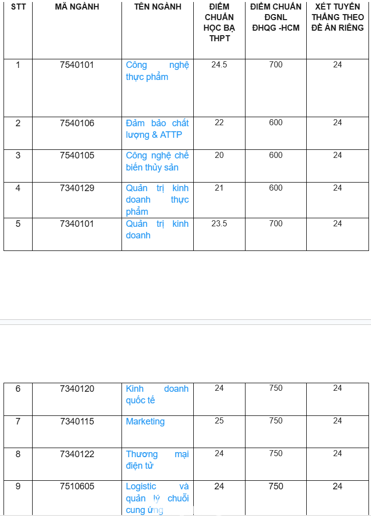 Theo đó điểm chuẩn của phương thức xét kết quả học tập THPT cả năm lớp 10, lớp 11 và HK1 lớp 12 dao động từ 20 – 25 điểm. Ngành có điểm cao nhất là ngành marketing với 25 điểm; kế đến Tài chính - Ngân hàng, Ngôn ngữ Trung Quốc và Công nghệ thực phẩm với 24,5 điểm; các ngành công nghệ kỹ thuật hóa học, công nghệ chế biến thủy sản, công nghệ dệt may, công nghệ sinh học,… với 20 điểm.