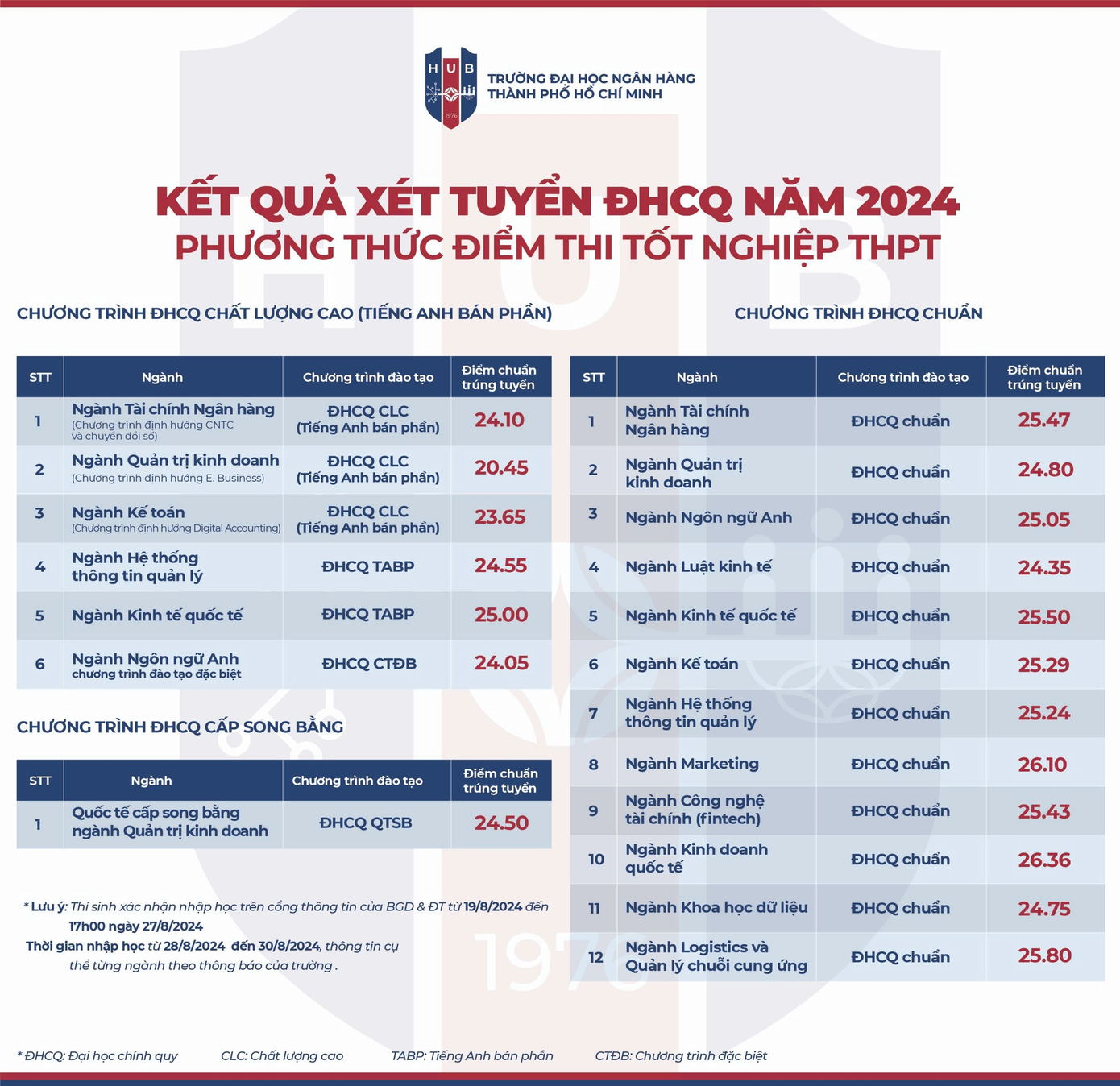 Trong khi đó, tại Trường ĐH Ngân hàng TPHCM dao động từ 20,45 điểm ở ngành Quản trị kinh doanh chất lượng cao (tiếng Anh bán phần) đến 26,36 điểm ngành Kinh doanh quốc tế.