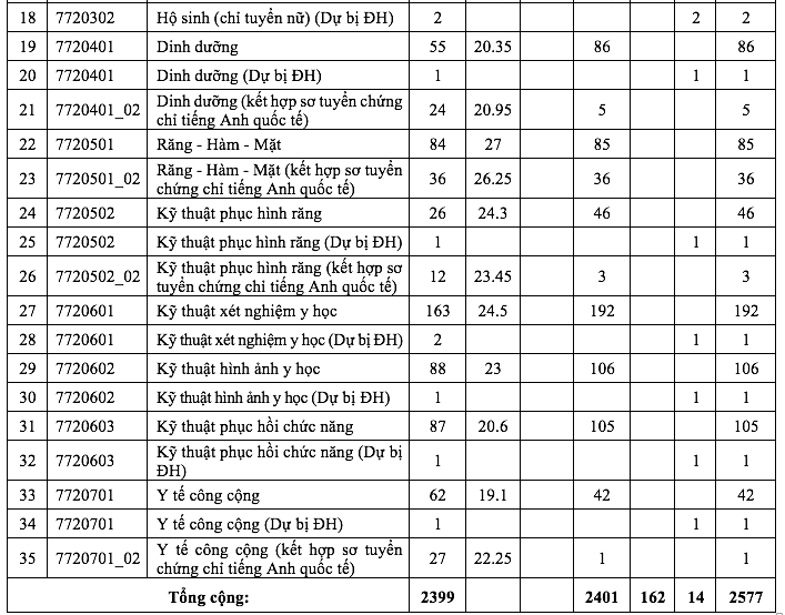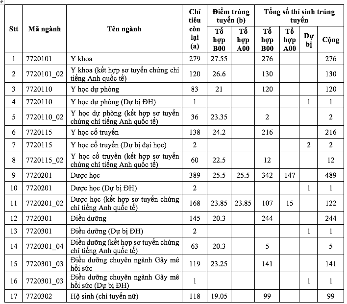 Theo đó, ngành y đa khoa có điểm chuẩn xét theo điểm kỳ thi tốt nghiệp THPT ở mức 27,55 điểm. Ở phương thức kết hợp sơ tuyển chứng chỉ tiếng Anh quốc tế, điểm chuẩn ngành y khoa ở mức 26,6 điểm.