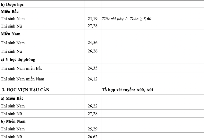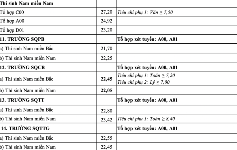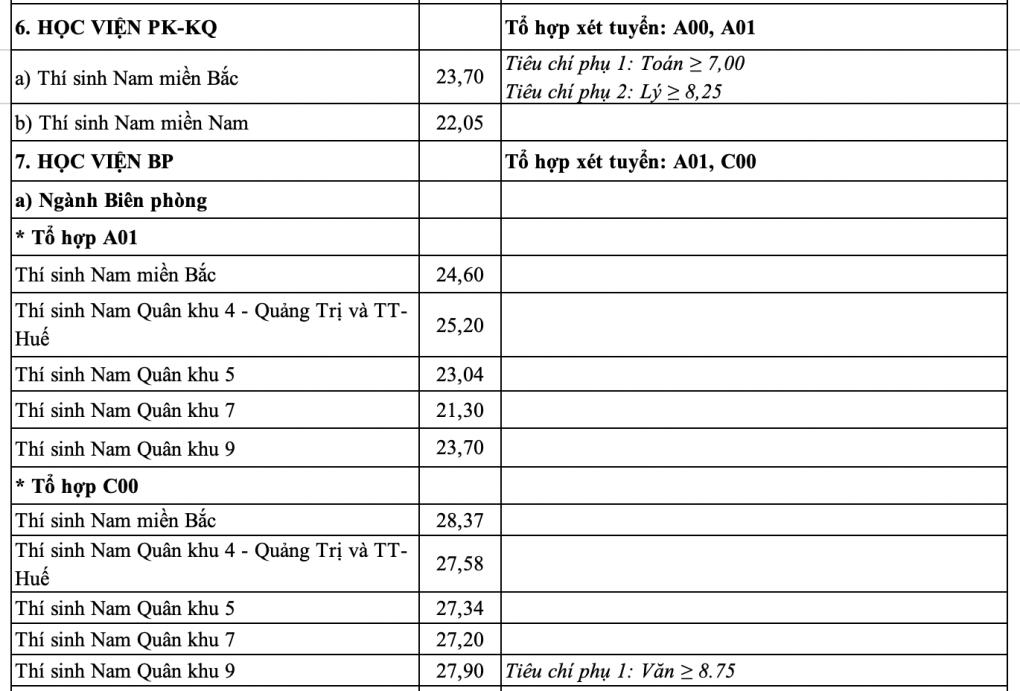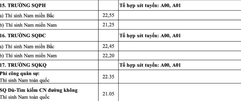 Điểm chuẩn vào các trường Quân đội năm 2024 cụ thể như sau: