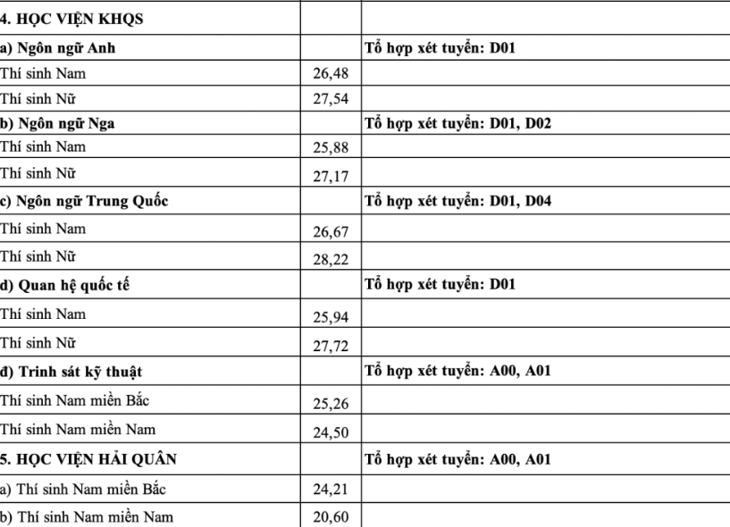 Năm 2023, điểm chuẩn ở mức cao như: Học viện Khoa học quân sự, ngành Ngôn ngữ Trung Quốc, tuyển thí sinh nữ điểm chuẩn trúng tuyển 27,97 điểm. Học viện Biên Phòng, ngành Luật học tuyển thí sinh miền Bắc, điểm chuẩn trúng tuyển là 27,47 điểm; ngành Biên phòng, tuyển sinh tổ hợp C00 (Văn, Sử, Địa), điểm chuẩn với thí sinh miền Bắc là 26,99 điểm. Học viện Hậu cần, thí sinh ở miền Bắc, điểm trúng tuyển là 26,01 điểm đối với thí sinh nữ và 25,6 điểm đối với thí sinh nữ ở miền Nam.