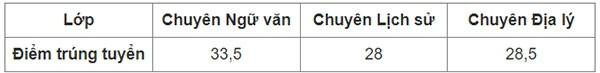 Trường THPT chuyên Khoa học Xã hội và Nhân văn, Đại học Khoa học Xã hội và Nhân văn (Đại học Quốc gia Hà Nội) đưa ra mức điểm chuẩn trúng tuyển vào các lớp chuyên Văn, Sử, Địa lần lượt 33,5 - 28 - 28,5. Cụ thể:
