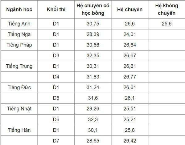 THPT chuyên Ngoại ngữ, Đại học Ngoại ngữ (Đại học Quốc gia Hà Nội) dao động từ 25 đến 26 điểm, cao nhất 26,77 điểm lớp tiếng Trung khối D3 (thấp hơn so năm trước, điểm dạo động mức từ 25 đến 28 điểm).
