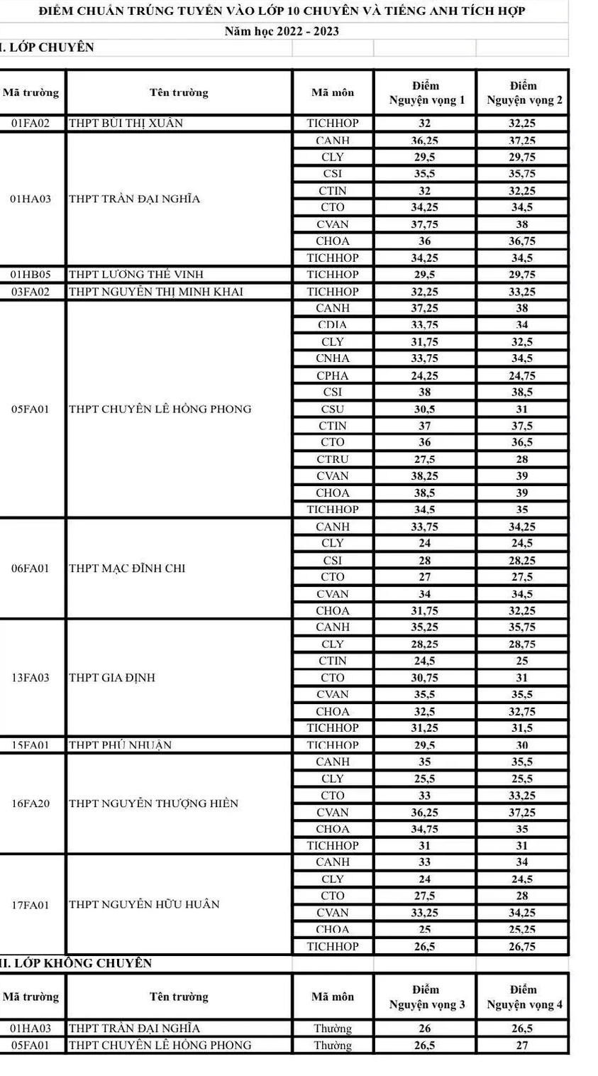 Ở lớp không chuyên của hai trường THPT chuyên Lê Hồng Phong, THPT chuyên Trần Đại Nghĩa, điểm chuẩn cho nguyện vọng đầu tiên là 26,5 điểm và 26 điểm. Ở nguyện vọng thứ hai, điểm chuẩn của hai trường lần lượt là 27 và 26,5 điểm.