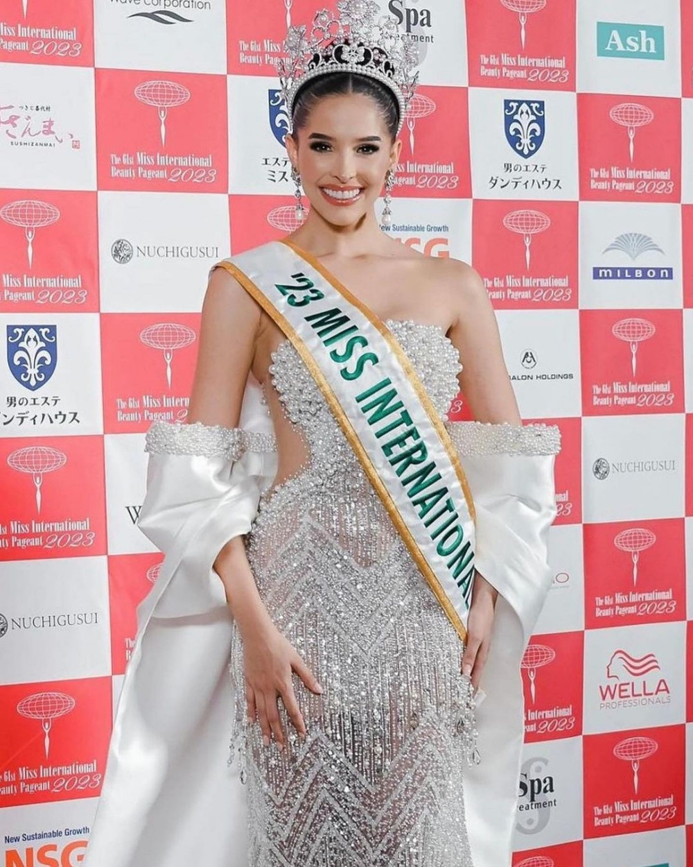 Bất ngờ là trang phục dạ hội của đại diện Venezuela, tân Miss International 2023 Andrea Rubio cũng mang màu sắc và đặc biệt là chi tiết chiếc nơ tương tự.