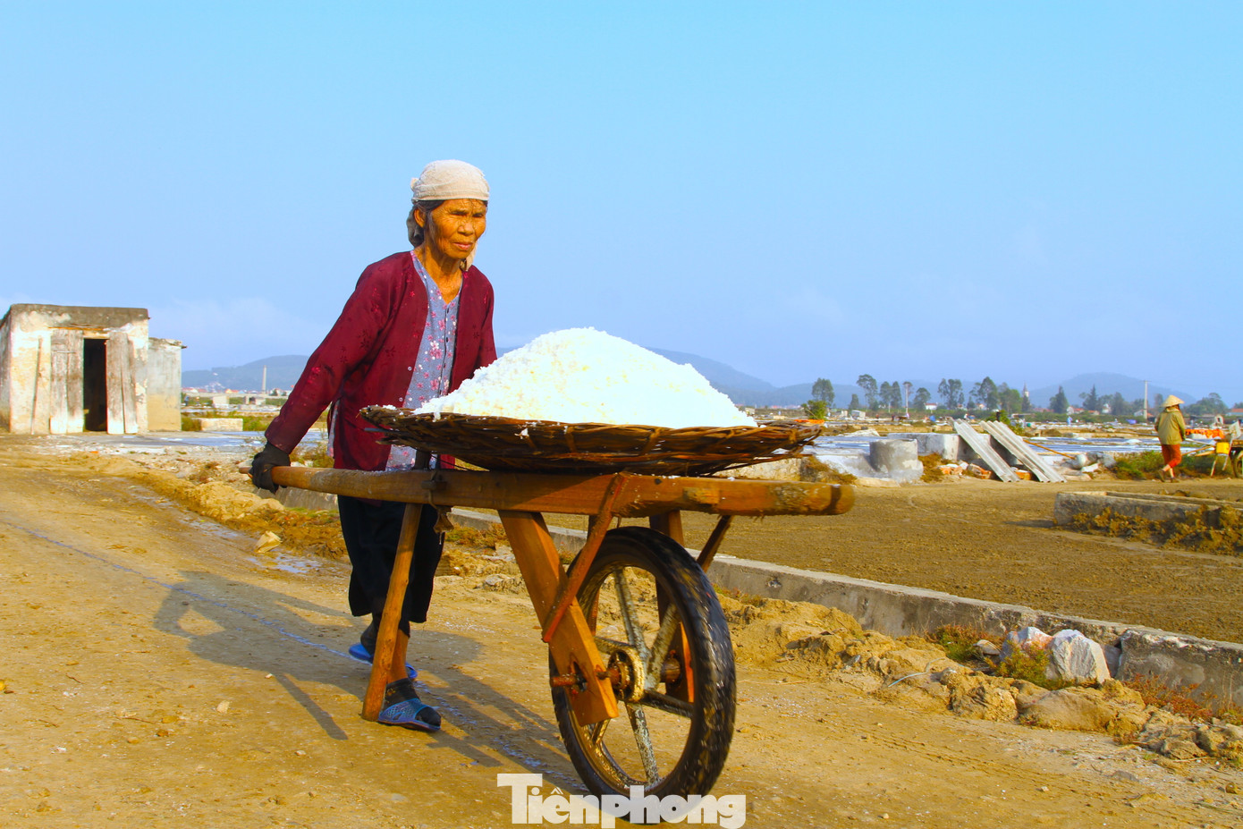 | Trong một năm, nghề làm muối chỉ được vài ba tháng nắng nên khi có nắng, bà con diêm dân tất bật trên cánh đồng. |