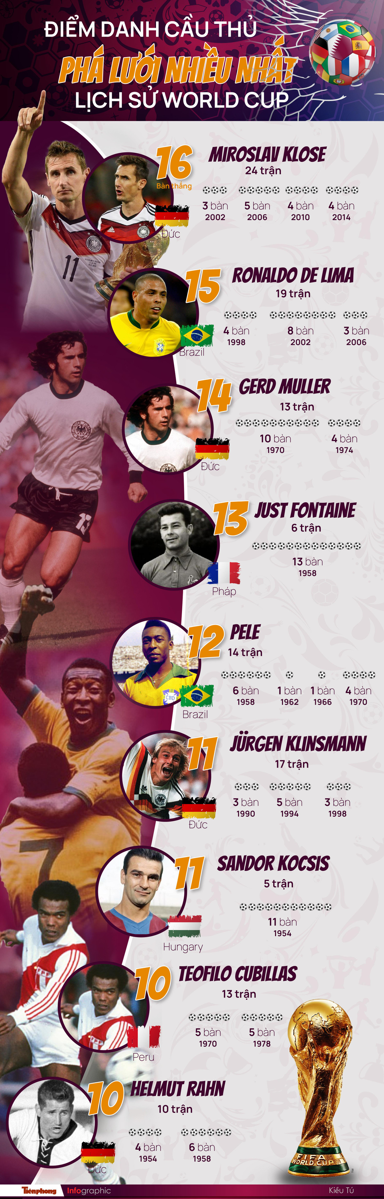 TPO - World Cup 2022 sẽ khởi tranh ngày 20/11, đây là một trong những giải bóng đá danh giá và hấp dẫn nhất hành tinh. Chính vì thế, các cầu thủ luôn muốn ghi thật nhiều bàn thắng, để có tên trên bảng vàng. Hãy cùng Tiền Phong điểm danh các cầu thủ 'phá lưới' nhiều nhất lịch sử World Cup.