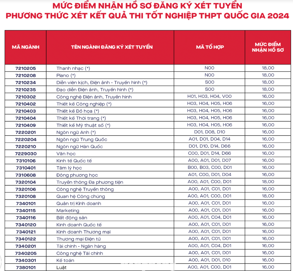 Ngành đạo diễn điện ảnh, truyền hình và ngành công nghệ điện ảnh, truyền hình có tổ hợp là V00, H01: Tổng điểm trung bình của 2 môn đạt từ 12 điểm và tham dự kỳ thi năng khiếu vẽ do trường tổ chức (điểm xét tuyển là tổng điểm của tổ hợp 3 môn, không nhân hệ số và áp dụng cho diện học sinh phổ thông - KV3).