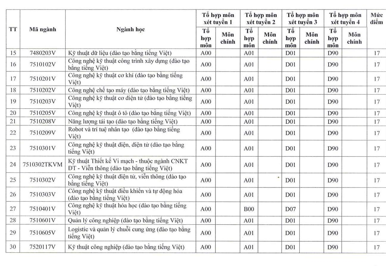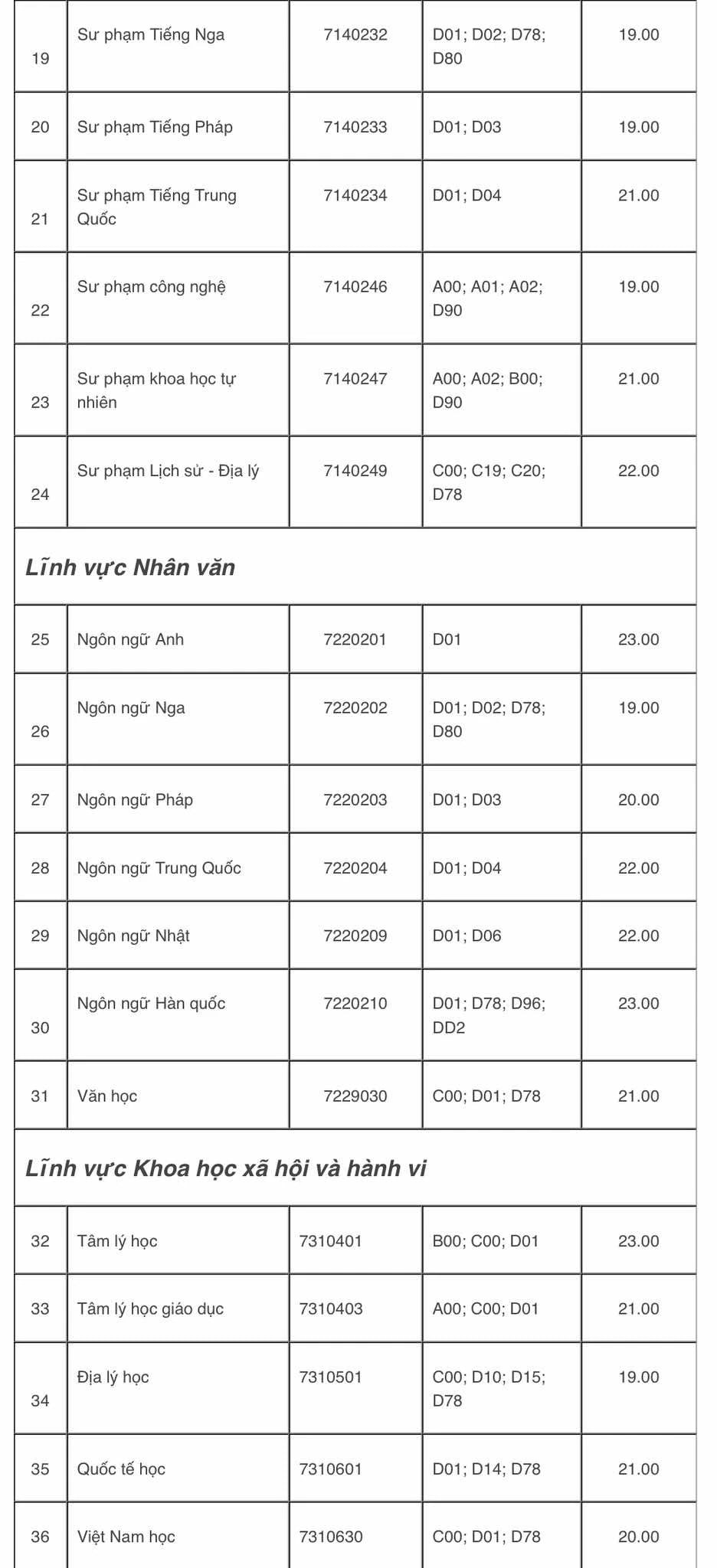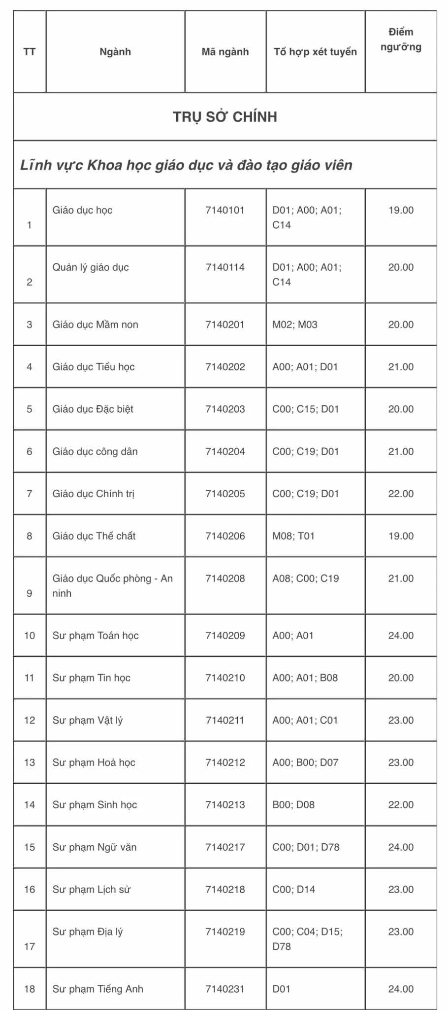 Theo đó, Sư phạm Toán, Sư phạm Tiếng Anh và Sư phạm Ngữ văn là ba ngành có mức điểm sàn cao nhất với 24 điểm. So với ngưỡng điểm sàn chung của Bộ GD&ĐT, các ngành này của trường có điểm sàn cao hơn 5 điểm. Ngành có điểm sàn thấp nhất là Giáo dục mầm non (trình độ Cao đẳng) với 17 điểm.