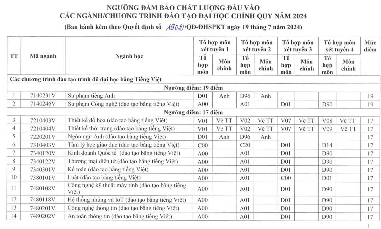 Trường Đại học Sư phạm Kỹ thuật TP.HCM đã công bố mức điểm nhận hồ sơ đăng ký xét tuyển theo phương thức xét tuyển kết quả kỳ thi tốt nghiệp THPT năm 2024. Theo đó, Sư phạm Tiếng Anh và Sư phạm Công nghệ (chương trình Tiếng Việt) là hai ngành có mức điểm nhận hồ sơ xét tuyển cao nhất với 19 điểm. Có 34 ngành lấy điểm sàn từ 17, các ngành còn lại là 15 điểm.