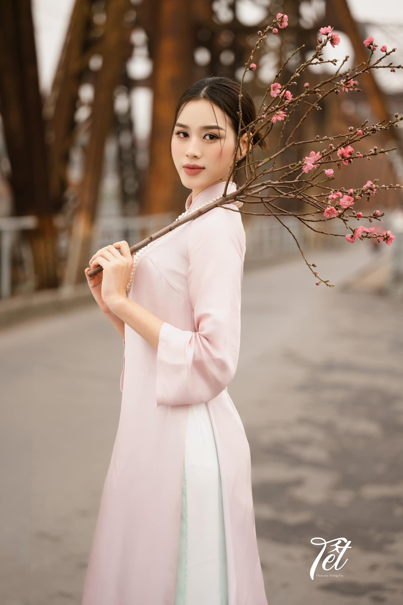 Đỗ Thị Hà còn chọn bối cảnh ở cầu Long Biên cổ kính, càng cho ra bộ ảnh đón Tết đậm không khí hoài cổ. Chọn một bộ áo dài lụa màu hồng nhạt, búi tóc theo kiểu phụ nữ Hà Nội xưa là nhìn nàng hậu đã mang đầy khí chất tiểu thư cổ điển.