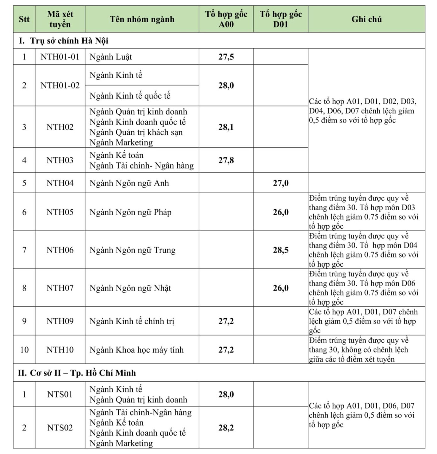 Theo đó, điểm trúng tuyển các nhóm ngành/ngành/chương trình tương đối đồng đều và có mức điểm cao nhất là 28,5 của tổ hợp gốc D01 đối với ngành Ngôn ngữ Trung Quốc - chuyên ngành Tiếng Trung Thương mại, tiếp theo là mức điểm 28,1 của tổ hợp gốc A00 đối với nhóm ngành Kinh doanh quốc tế, Quản trị kinh doanh, Quản trị khách sạn và Marketing; mức điểm 28,0 của tổ hợp A00 đối với nhóm ngành Kinh tế và Kinh tế quốc tế. Có 7 ngành trên tổng số 15 ngành của trường có mức điểm trúng tuyển theo tổ hợp A00 từ 28 điểm trở lên, 95% chỉ tiêu có ngưỡng điểm trúng tuyển trên 27 điểm.
