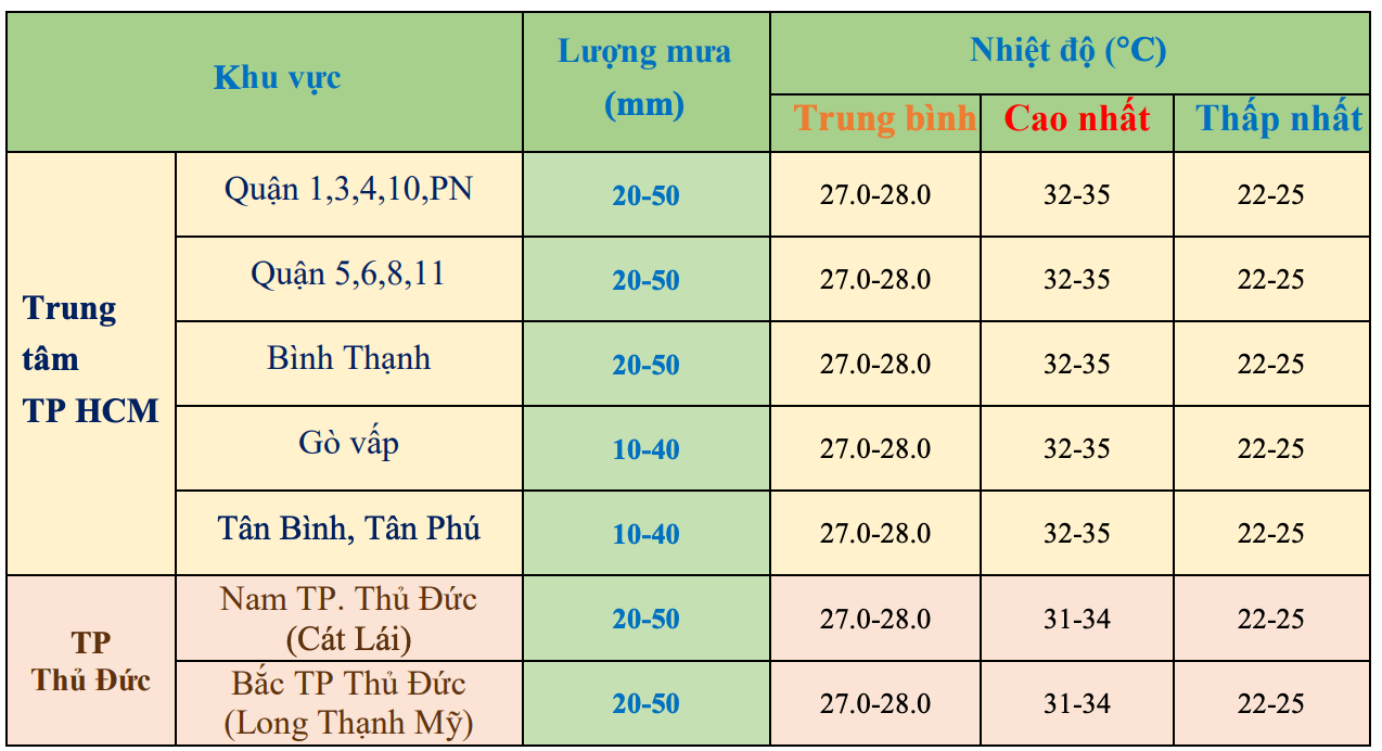 Theo dự báo từ Đài Khí tượng Thủy văn khu vực Nam bộ, trong ngày hôm nay (12/3) và các ngày 16-17/3, khu vực TPHCM sẽ có mưa trái mùa ở vài nơi với khả năng có mưa vừa, mưa to cục bộ. Nhiệt độ cao nhất phổ biến 31-34 độ C; thấp nhất 22-26 độ C.