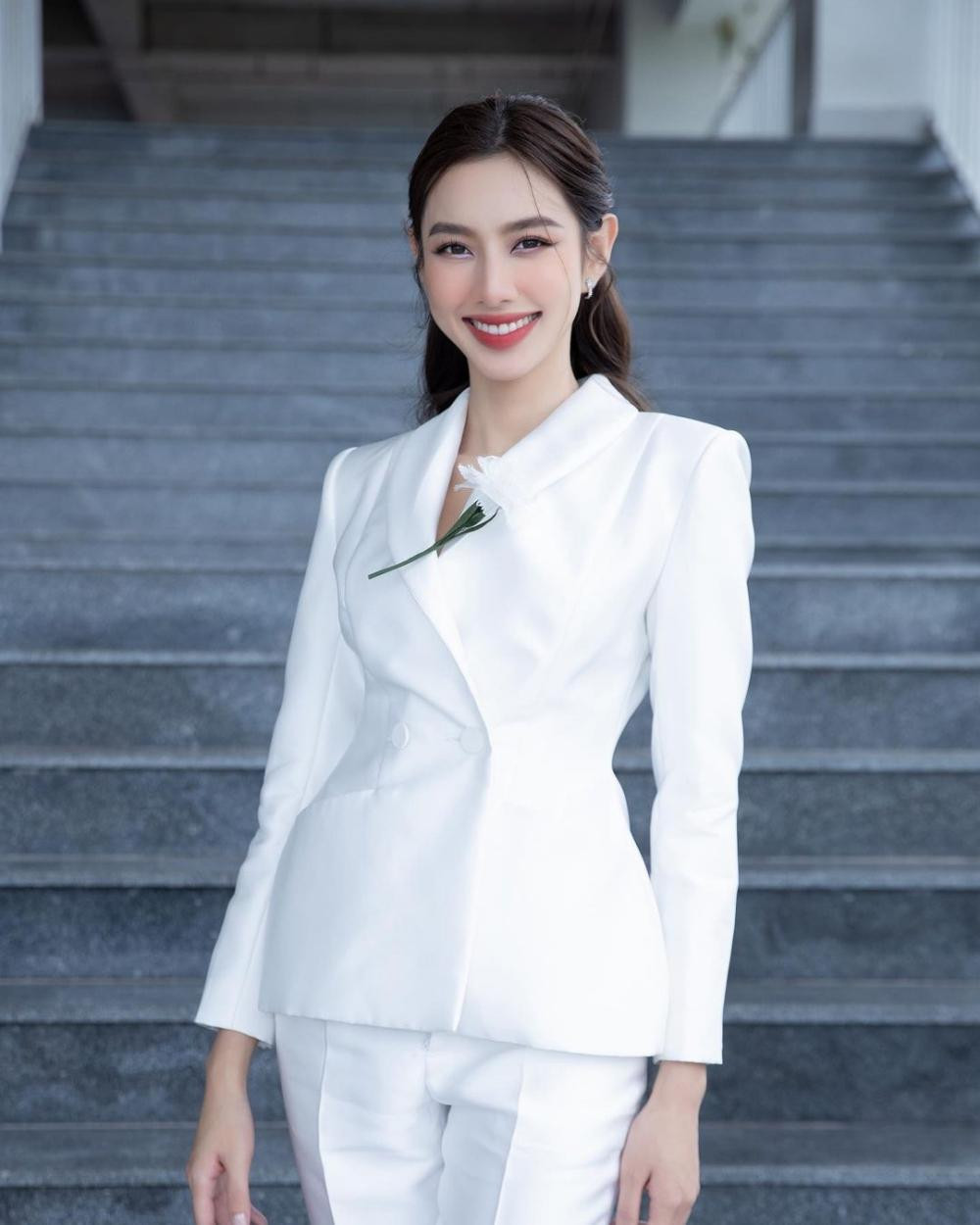 Mới đây, khi tham gia buổi giao lưu với các sinh viên đại học, Hoa hậu Thuỳ Tiên diện bộ suit trắng, xinh đẹp thanh lịch như một cô nàng đàn chị cựu sinh viên thành đạt.