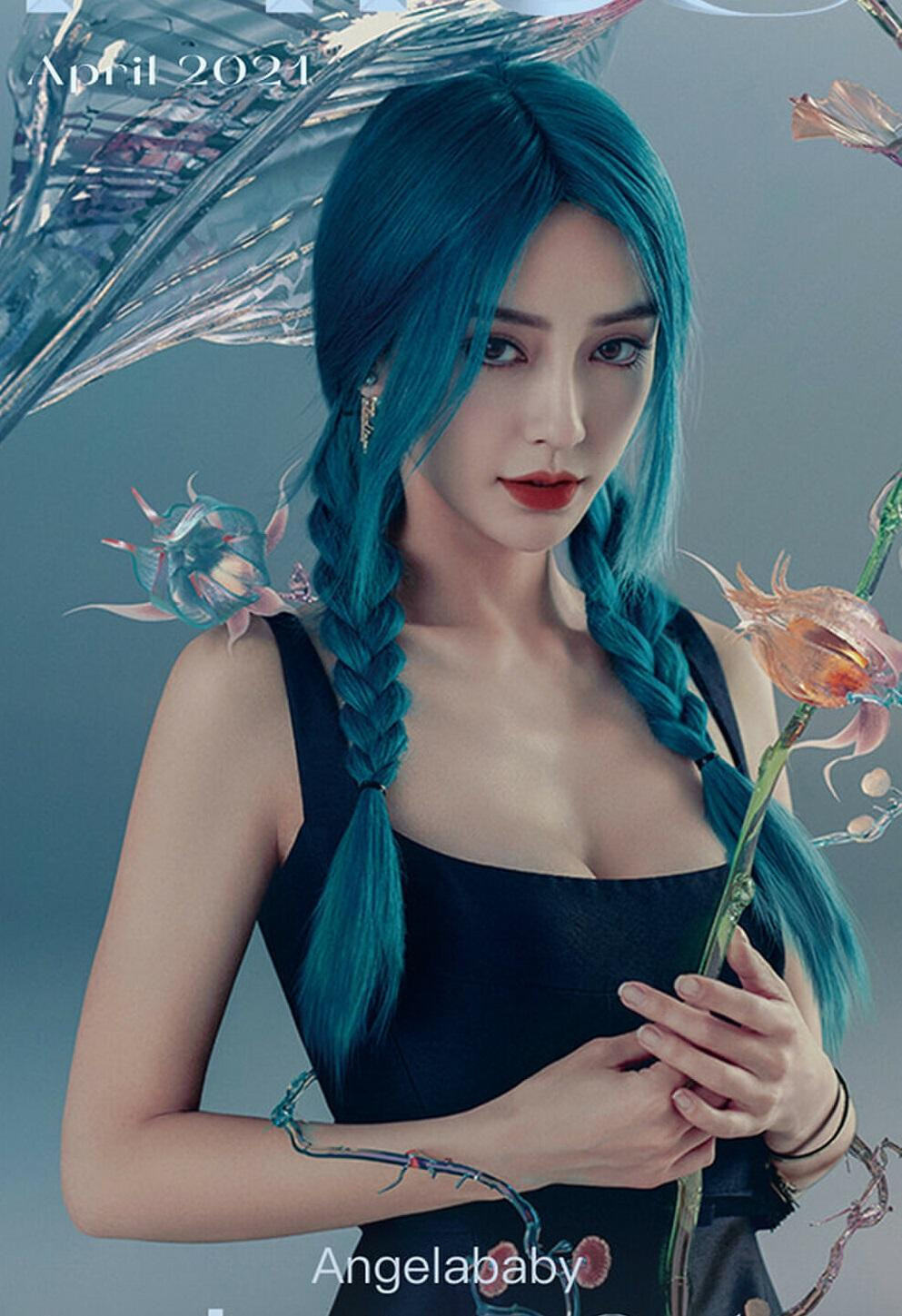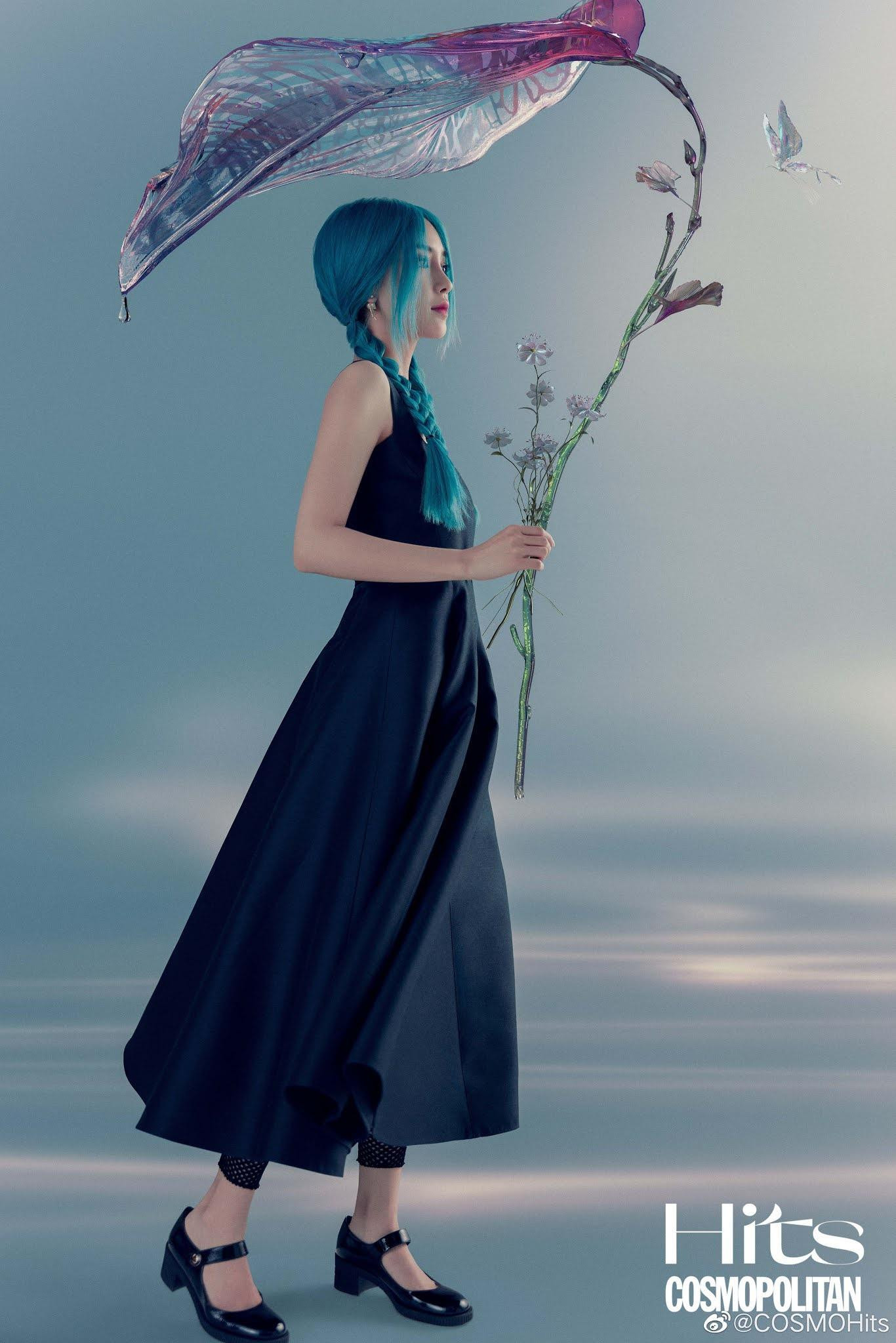 Diễn set đồ giống hệt Jisoo nhưng mỹ nhân C-Biz đem đến cảm giác khác lạ, tươi mới với mái tóc xanh biếc đậm chất cổ tích kỳ ảo. Vóc dáng mảnh mai của Angelababy cũng rất hợp với những mẫu váy cổ điển này.