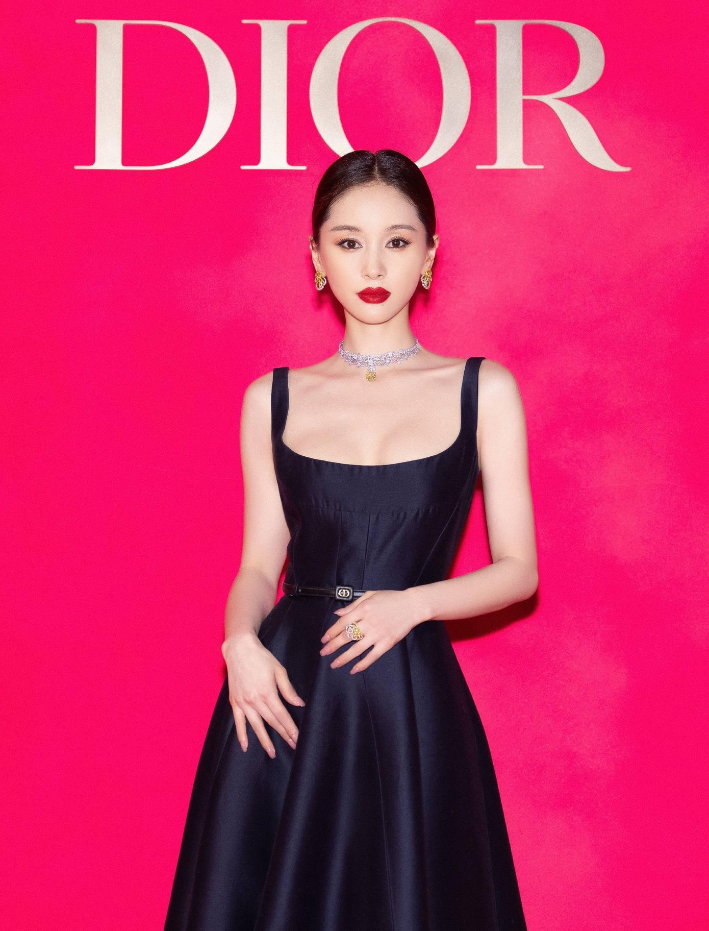 Một nàng thơ Dior khác là Vương Tử Văn cũng mặc thiết kế lấy cảm hứng từ Jisoo khi đi dự sự kiện của nhà mốt. Cô khéo léo dùng thêm phụ kiện thắt lưng bản nhỏ để nhấn mạnh vòng eo thon thả.