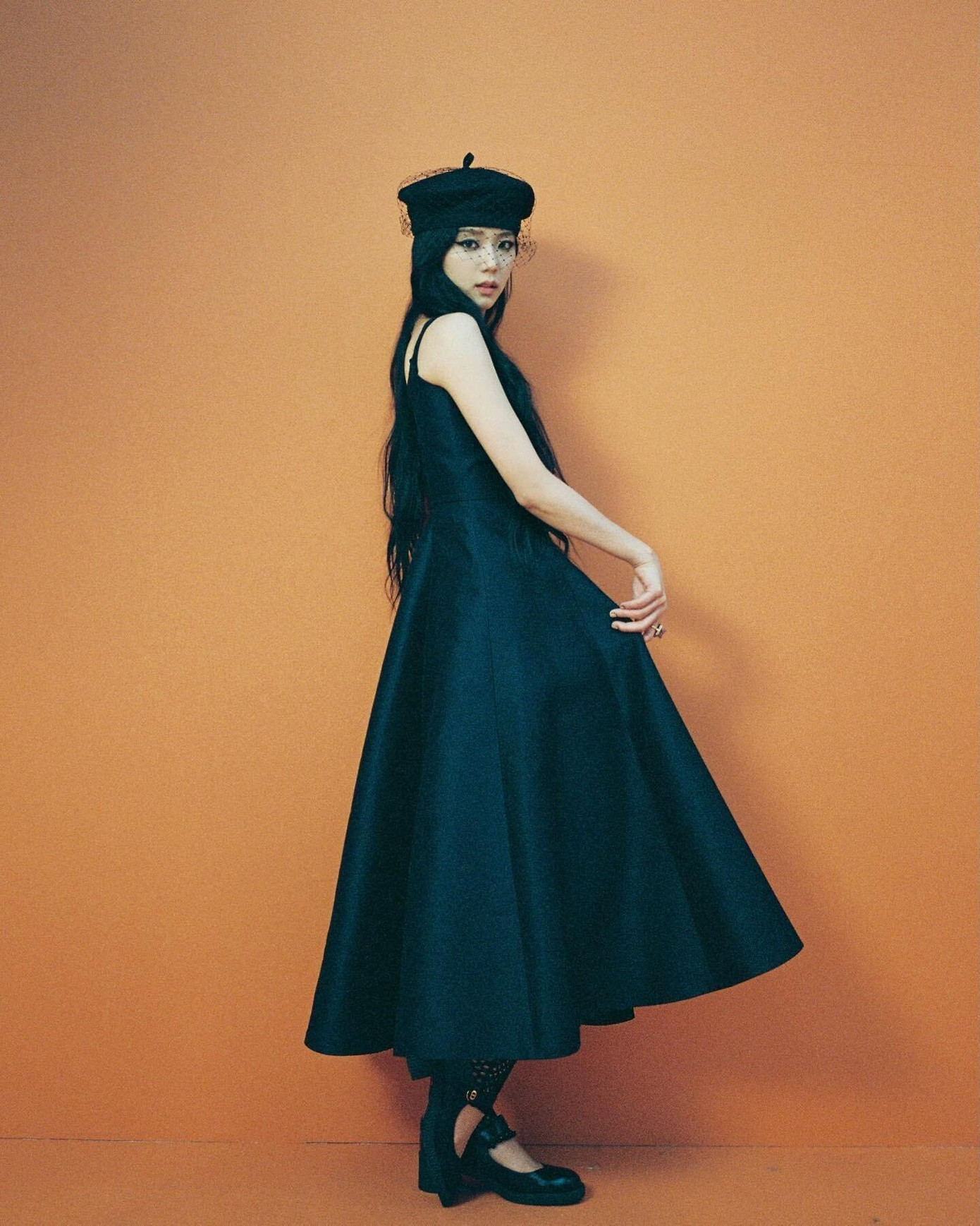Jisoo được netizen khen ngợi vì thần thái tiểu thư khi diện một chiếc váy đen xòe bồng mềm mại, kết hợp với tất lưới, giày búp bê và mũ đính ren.