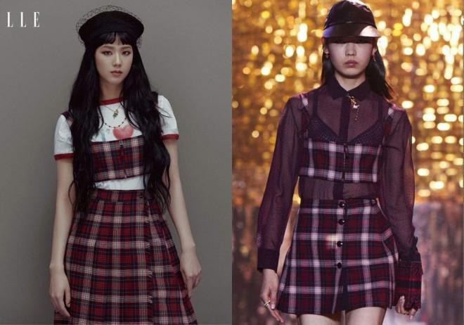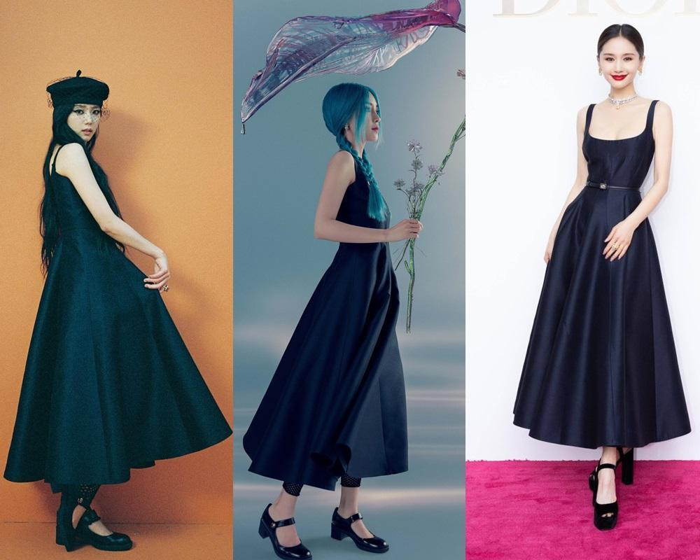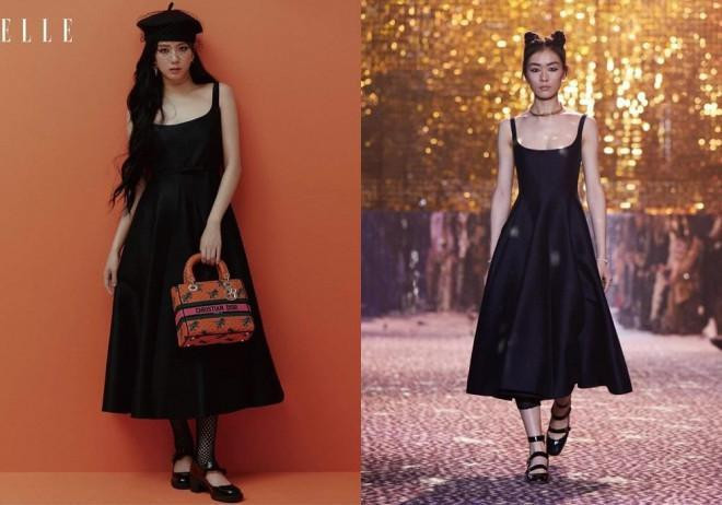 Angelababy thường xuyên diện các thiết kế mới của Dior và cũng từng mặc mẫu váy này khi chụp ảnh tạp chí. Nếu như Jisoo đã chỉnh sửa phần cổ để trông kín đáo hơn thì Angelababy giữ nguyên thiết kế gốc.