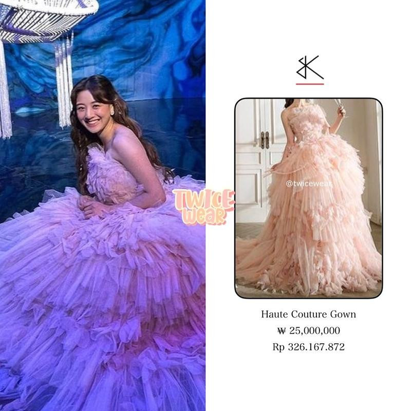 Tiếp theo hiện tại là Jihyo với thiết kế cao cấp dòng Haute Couture của thương hiệu váy cưới Bridal Kong, có giá lên tới khoảng 500 triệu đồng. So với các thiết kế đắt đỏ của BLACKPINK, mẫu váy của Jihyo tuy đẹp nhưng được nhận xét là hơi cồng kềnh và nặng nề.