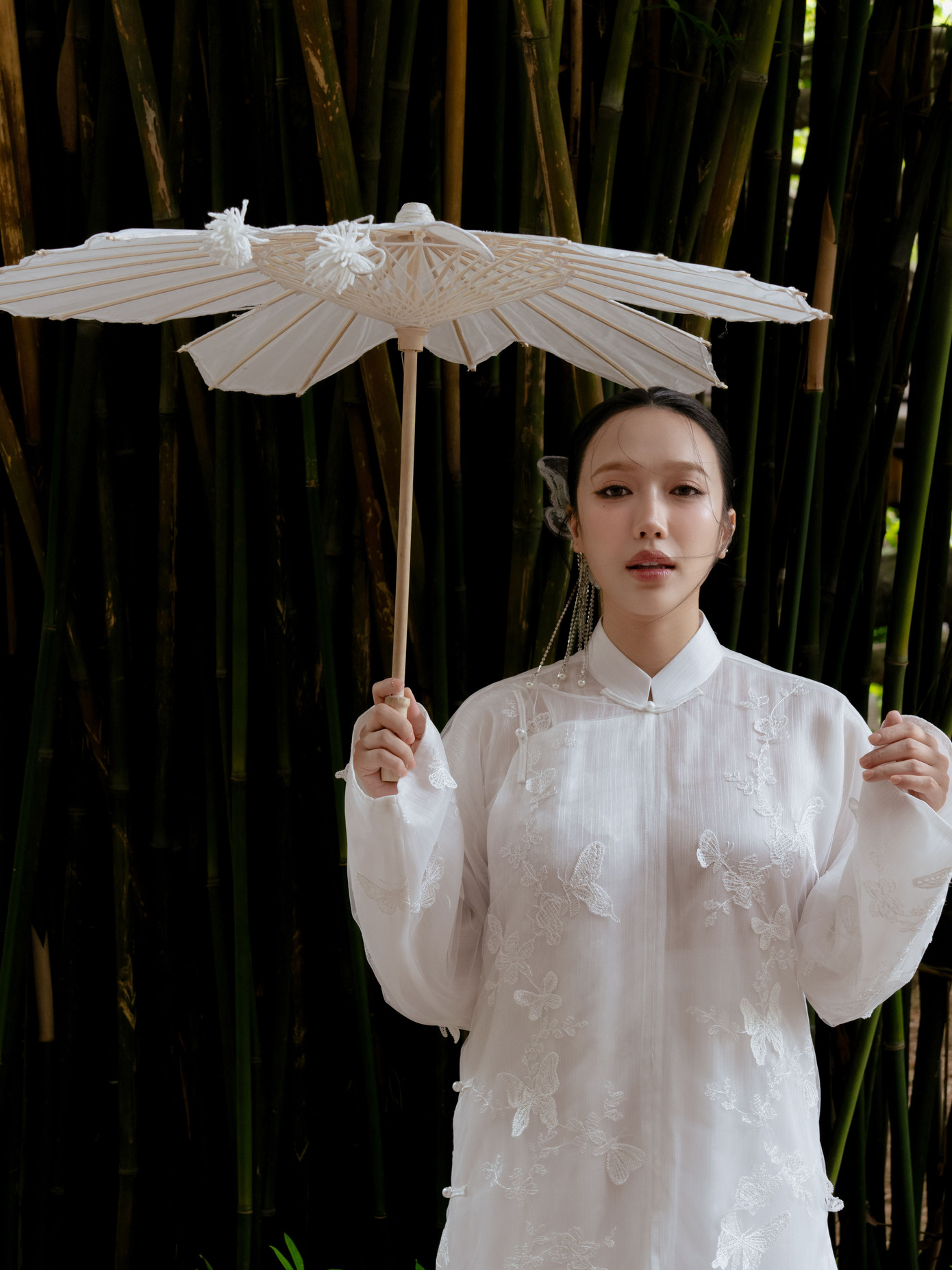 Diệu Nhi khéo léo phối các mẫu phụ kiện phù hợp để trang phục trở nên hút mắt hơn. Trong đó, mẫu lọng bướm trắng đi cùng áo dài voan có họa tiết thêu nổi khiến cô vừa truyền thống vừa hiện đại. Các mẫu trâm cài tóc, vòng cổ ngọc trai, vòng tay bạc... mang đến sự quý phái cũng như thể hiện gu thời trang ngày càng ấn tượng của nữ diễn viên.