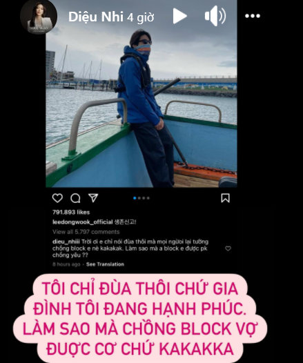 Đứng trước những phản hội có phần dữ dội của cộng đồng mạng, Diệu Nhi đã lên tiếng đính chính vụ việc. Cô cho biết đây chỉ là lời nói đùa bằng cách bình luận trực tiếp vào bài đăng của Lee Dong Wook, nhằm chứng minh cô hoàn toàn không bị chặn. Bên cạnh đó, Diệu Nhi vẫn không quên khẳng định mối quan hệ "vợ chồng" của cô vẫn hạnh phúc.