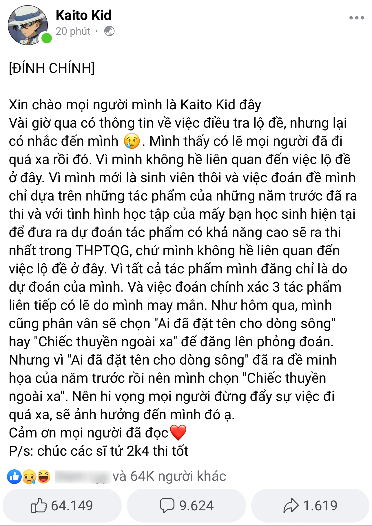 "Xin chào mọi người mình là Kaito Kid đây. Vài giờ qua có thông tin về việc điều tra lộ đề, nhưng lại có nhắc đến mình. Mình thấy có lẽ mọi người đã đi quá xa rồi đó. Vì mình không hề liên quan đến việc lộ đề ở đây. Vì mình mới là sinh viên thôi và việc đoán đề mình chỉ dựa trên những tác phẩm của những năm trước đã ra thi và với tình hình học tập của mấy bạn học sinh hiện tại để đưa ra dự đoán tác phẩm có khả năng cao sẽ ra thi nhất trong THPT Quốc gia, chứ mình không hề liên quan đến việc lộ đề ở đây. Vì tất cả tác phẩm mình đăng chỉ là do dự đoán của mình. Và việc đoán chính xác 3 tác phẩm liên tiếp có lẽ do mình may mắn.