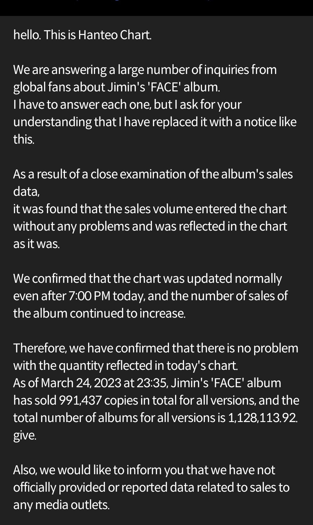 Cụ thể, kể từ khi FACE được phát hành, Hanteo vẫn liên tục cập nhật đầy đủ doanh số bán ra của album, giúp Jimin phá kỉ lục trở thành nghệ sĩ solo K-Pop bán chạy nhất trong ngày đầu chỉ trong 5 giờ đồng hồ. Tuy nhiên, ngay sau đó ARMY (fandom của BTS) đã nhanh chóng nhận thấy Hanteo không cập nhật thêm bất kì doanh số bán ra nào khác và hoàn toàn đóng băng trong hơn 3 giờ.