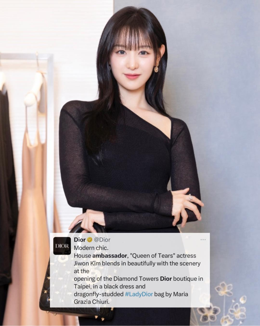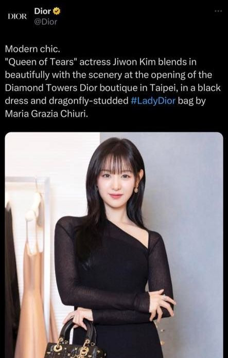 Kim Ji Won trở thành tâm điểm sự kiện khai trương cửa hàng Dior tại Đài Loan (Trung Quốc) vào ngày 25/6. Nữ diễn viên sở hữu 13,5 triệu người theo dõi trên Instagram nhận về phản hồi tích cực nhờ diện mạo lộng lẫy, sang trọng tại sự kiện. Người đẹp diện đầm đen lệch vai, lăng xê thiết kế túi xách Lady Dior trứ danh, khoe visual bừng sáng với tóc mái thưa. Tại hiện trường diễn ra sự kiện, người hâm mộ tụ tập đông kín khu phố, mong chờ được gặp thần tượng.