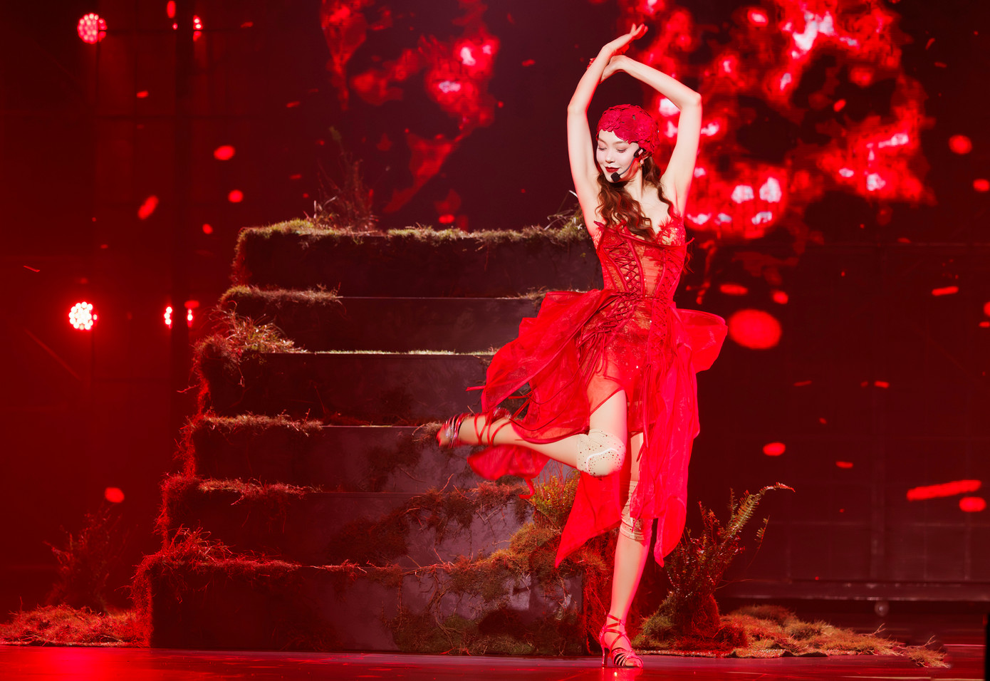 Trên sân khấu, Minh Hằng diện trang phục đỏ rực. Nữ ca sĩ cho biết cô hóa thành bông hoa, mượn cầu thang để truyền tải thông điệp muốn thành công phải chịu vất vả, rèn được sự kiên cường.