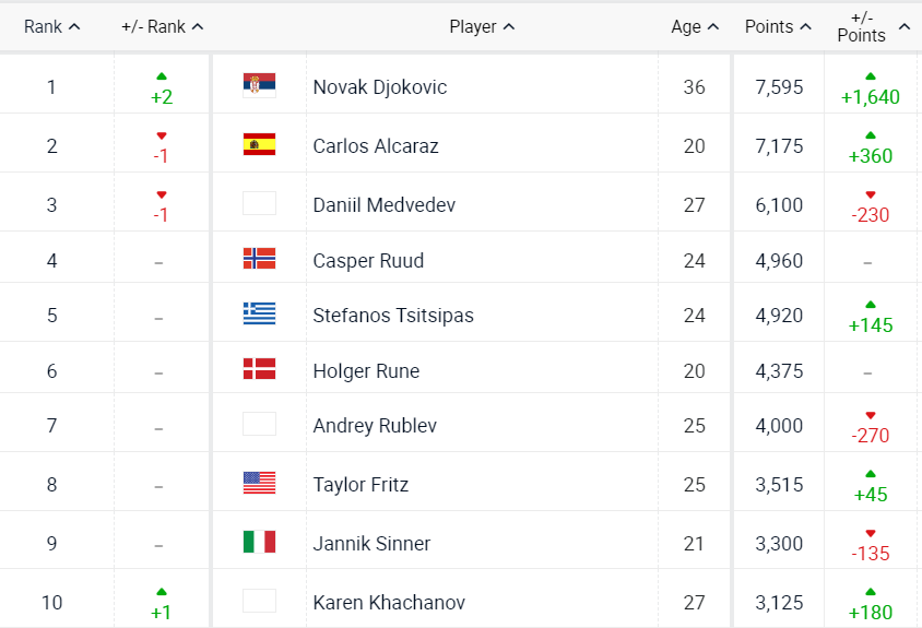 Bại tướng của Djokovic trong trận chung kết Roland Garros 2023, Casper Ruud không có thêm điểm nào bởi lẽ thành tích của anh không thay đổi so với năm ngoái. Ở Roland Garros 2022, Casper Ruud cũng thua trắng Rafael Nadal sau 3 sét.