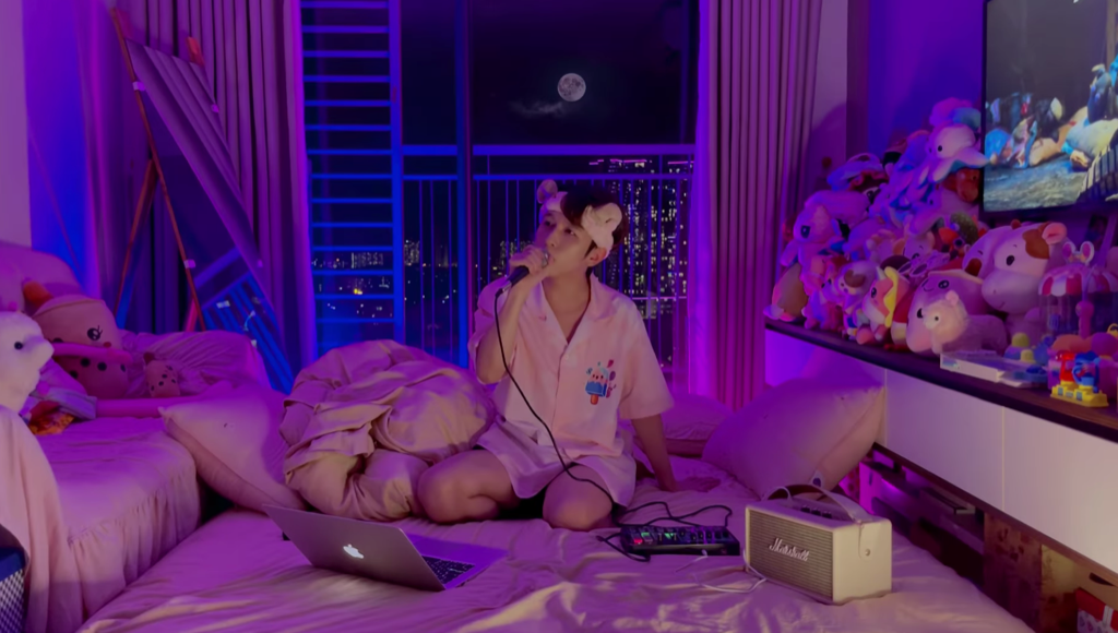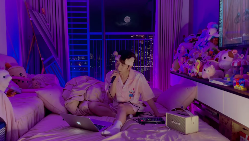 Toàn bộ show Live At Home đều diễn ra trong không gian làm nhạc tại nhà của Vũ Thảo My. Nhờ vào việc set up đèn led với màu sắc “ảo diệu” nên “sân khấu” trình diễn của giọng ca sinh năm 1997 cũng đẹp mắt hơn.
