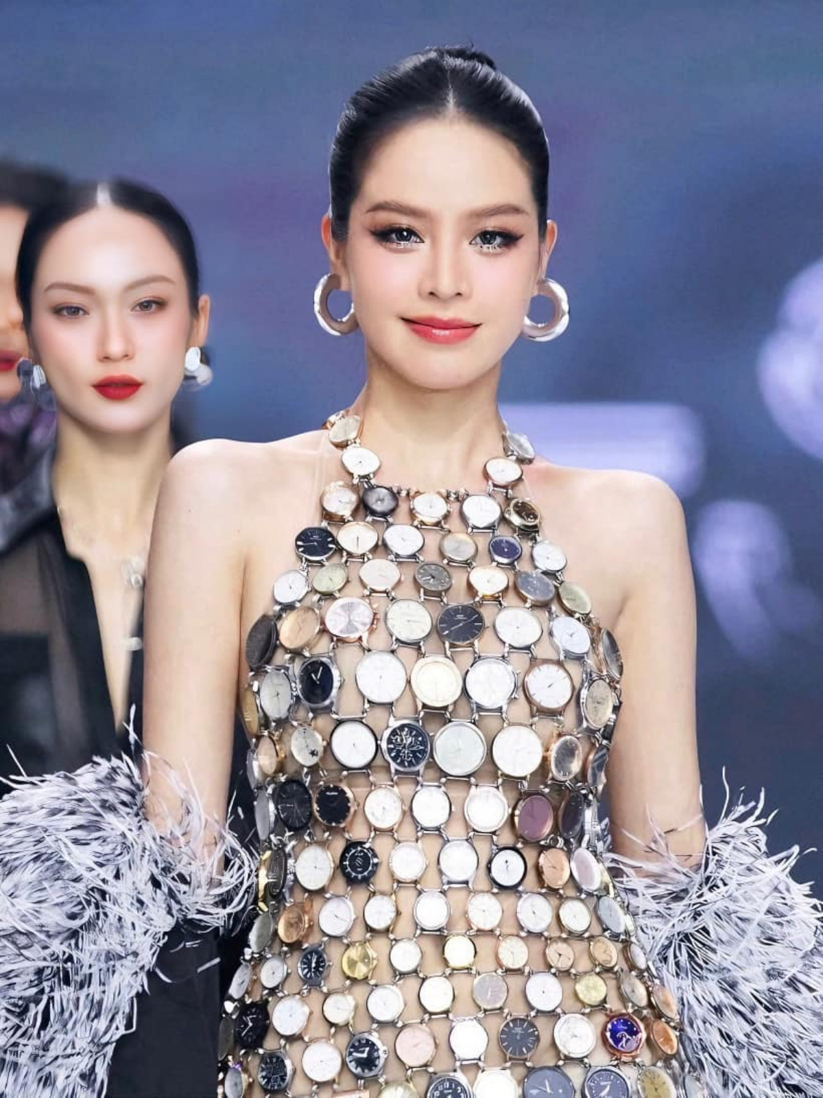 Đương kim Hoa hậu Việt Nam 2022 Huỳnh Thị Thanh Thủy mở màn với thiết kế vô cùng độc đáo làm từ mặt đồng hồ cũ.