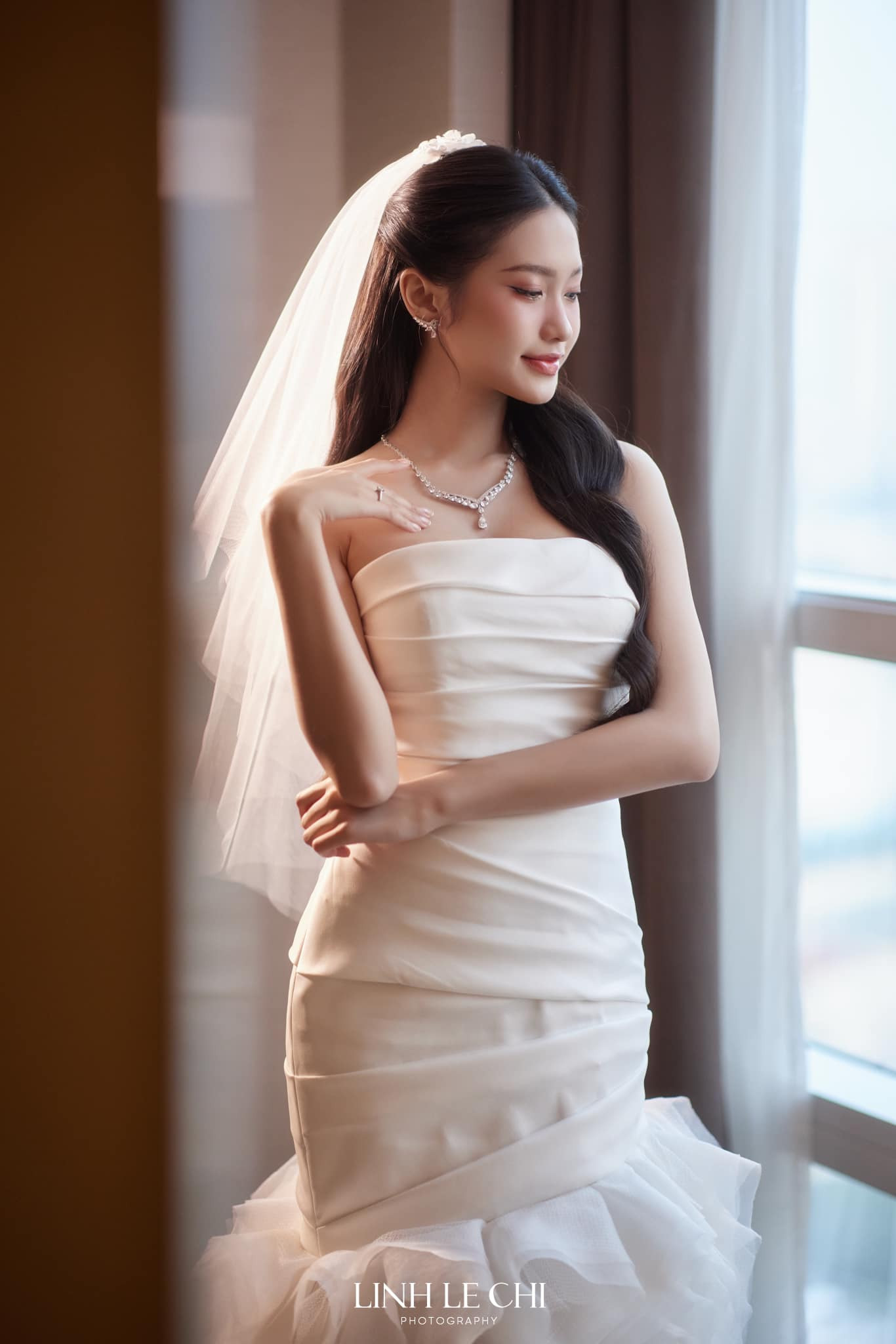 Tạo hình của Doãn Hải My cũng rất đơn giản khi chỉ buộc tóc nửa đầu và cài khăn voan. Thế nhưng, khán giả vẫn phải xuýt xoa khen ngợi nhan sắc thanh thuần trong veo của "cô dâu tháng 11".