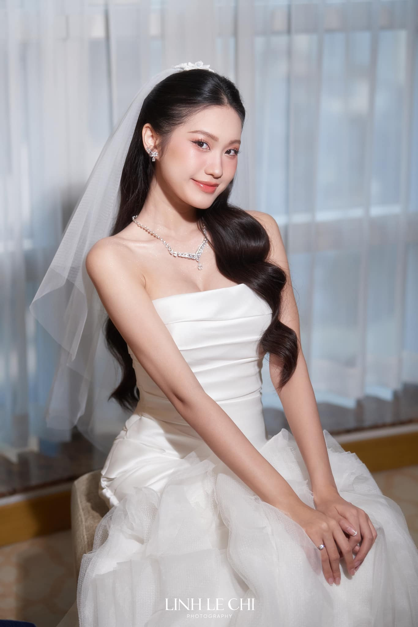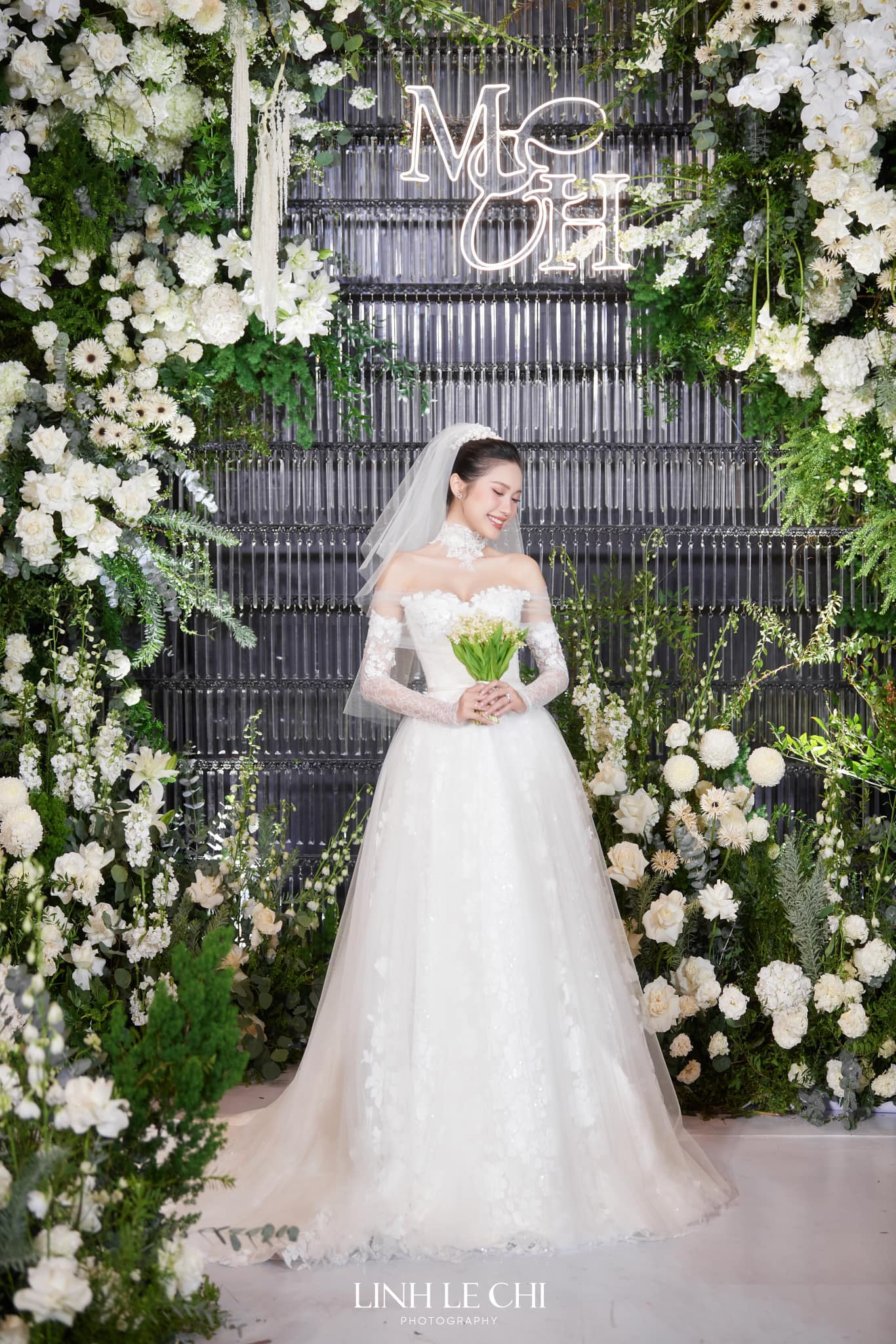 Bộ váy dáng chữ A bồng bềnh tôn lên vóc dáng thanh mảnh của cô dâu, lớp voan đính kết những bông hoa linh lan xinh xắn rất phù hợp với nhan sắc yêu kiều của Doãn Hải My.