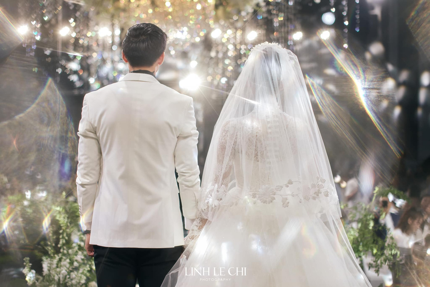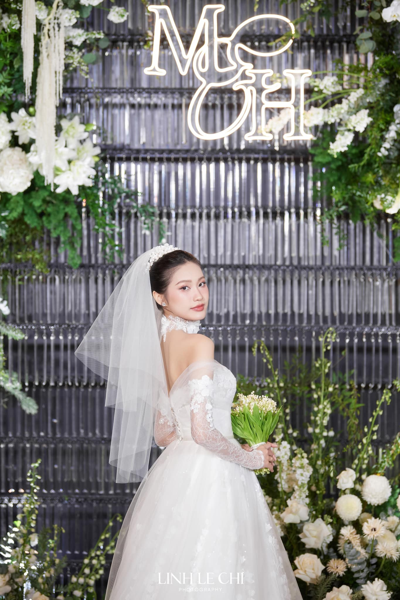 Đến khi chính thức làm lễ, Doãn Hải My thay sang bộ váy khác cầu kỳ, ấn tượng hơn. Thiết kế dài tay với lớp ren bên ngoài giúp cô dâu nhìn rất thanh lịch, sang trọng mà vẫn đủ ấn tượng trên sân khấu.