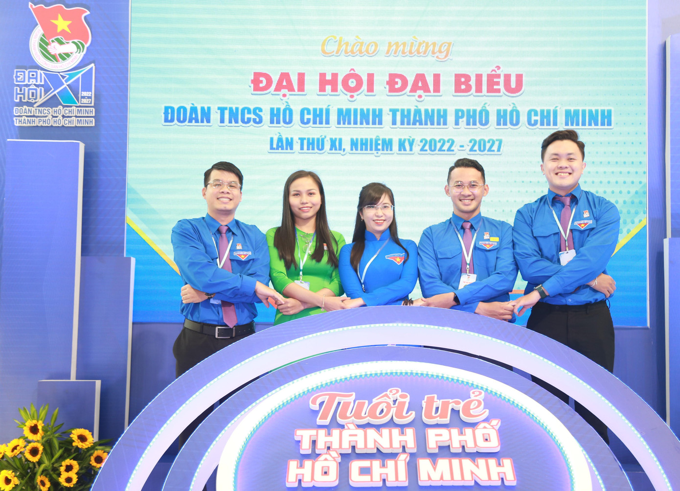 | Anh Bùi Quang Huy cùng lãnh đạo TPHCM trao hoa chúc mừng tập thể Ban Chấp hành Thành Đoàn TPHCM khóa XI, nhiệm kỳ 2022 - 2027. |