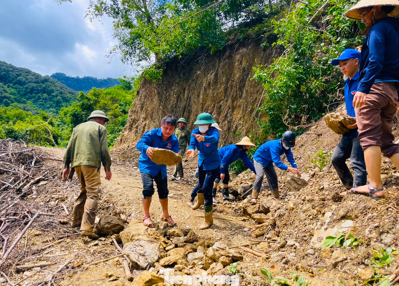 | "Tuyến đường này dài 3km, các đoàn viên và mọi người phải lội bộ vào sửa đường. Dọc đường gặp điểm nào hư hỏng, các đoàn viên dừng lại sửa, đảm bảo xe có thể lưu thông qua. Có nhiều điểm đất đá sạt xuống vùi lấp cả một đoạn dài. Lượng đất đá sạt lở nhiều nên rất khó nhọc mới làm được", chị Lô Thị Lan - Bí thư Đoàn thị trấn Thạch Giám (huyện Tương Dương) nói. |